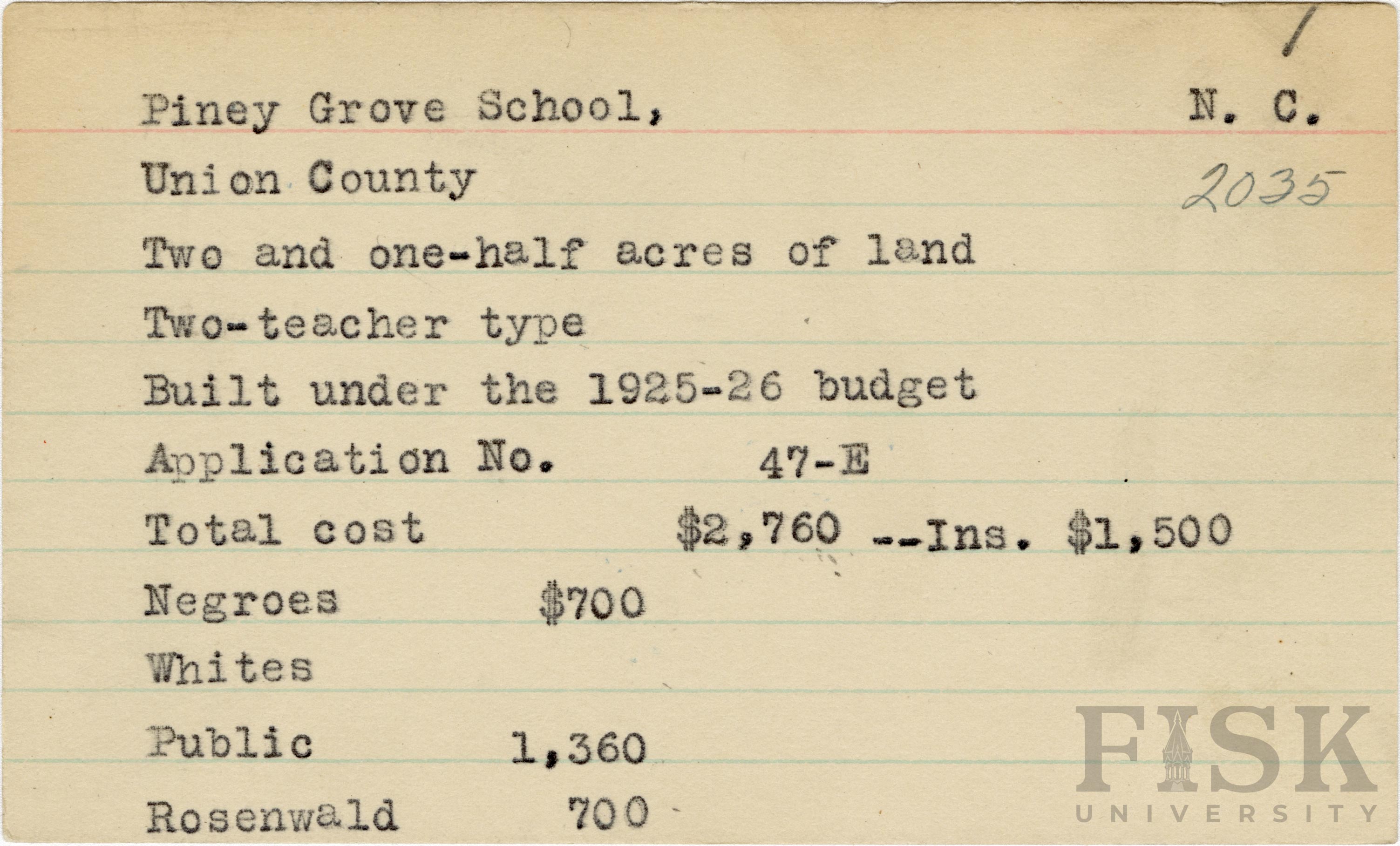 - Julius Rosenwald Fund--Buildings, African American schools--History--20th century, African American schools--Piney Grove School