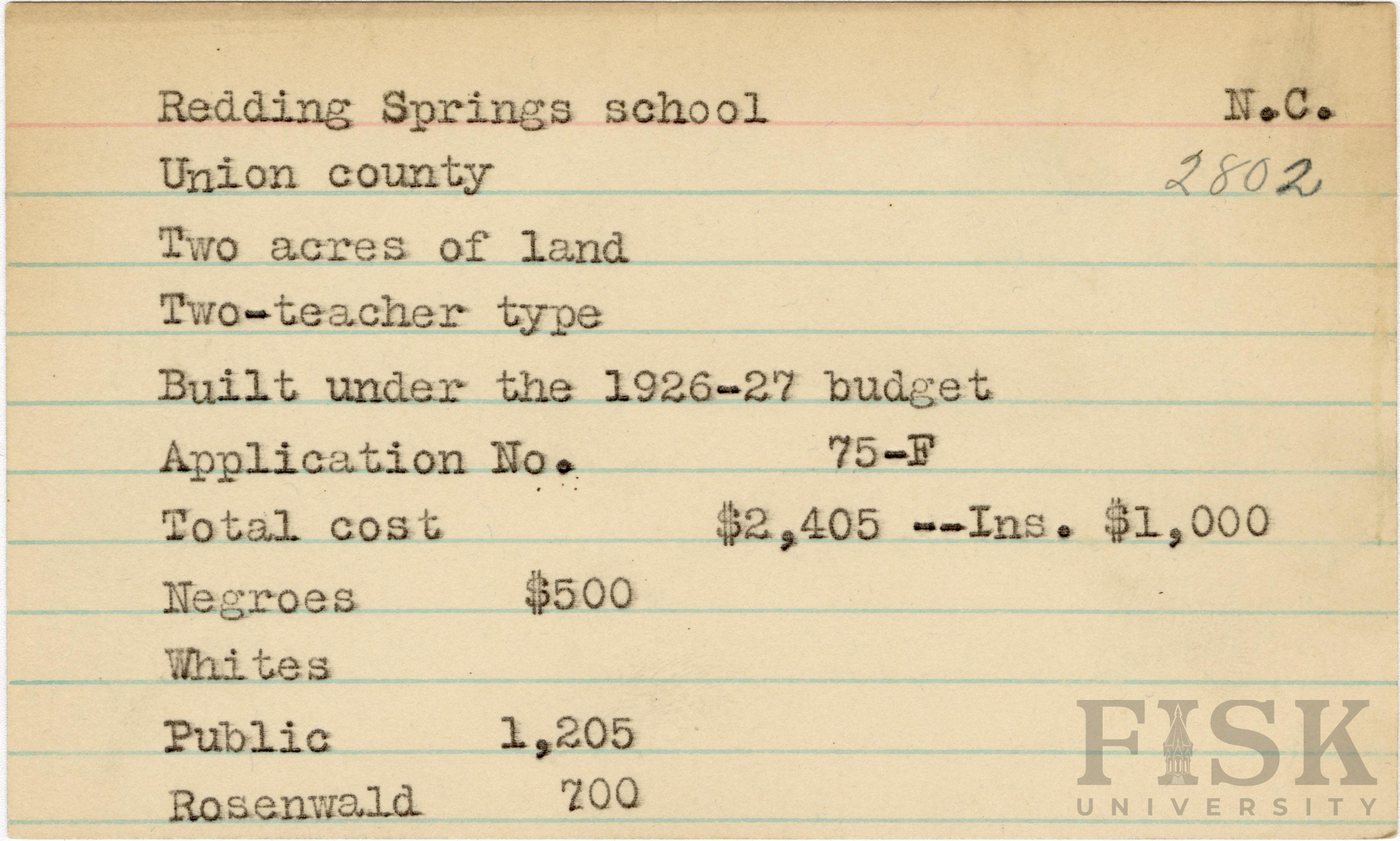 - School card for Redding Springs School in Union County, North Carolina with a section added to the budget contributions that says, "Ins. $1,000"