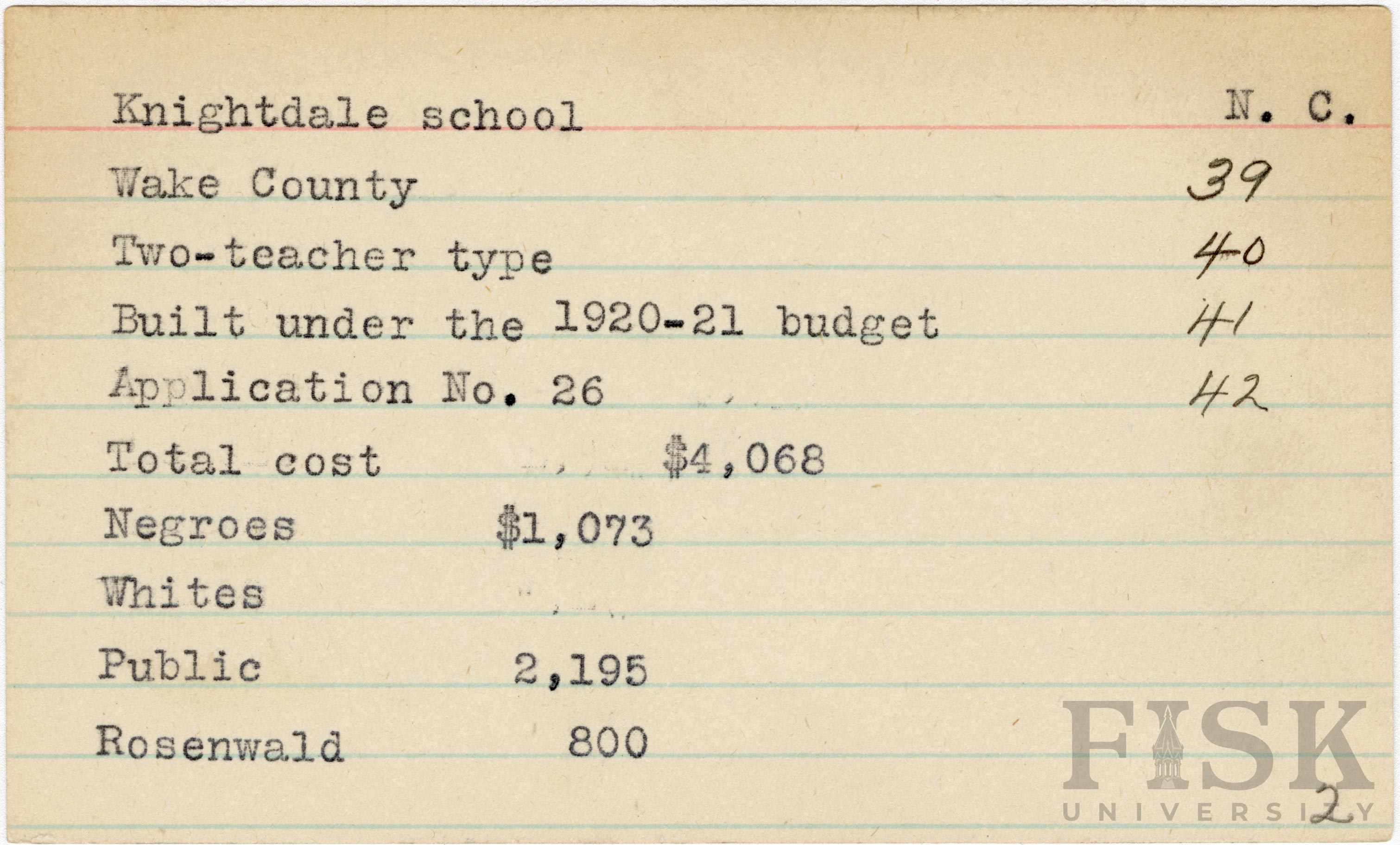 School card for Knightdale School in Wake County, North Carolina