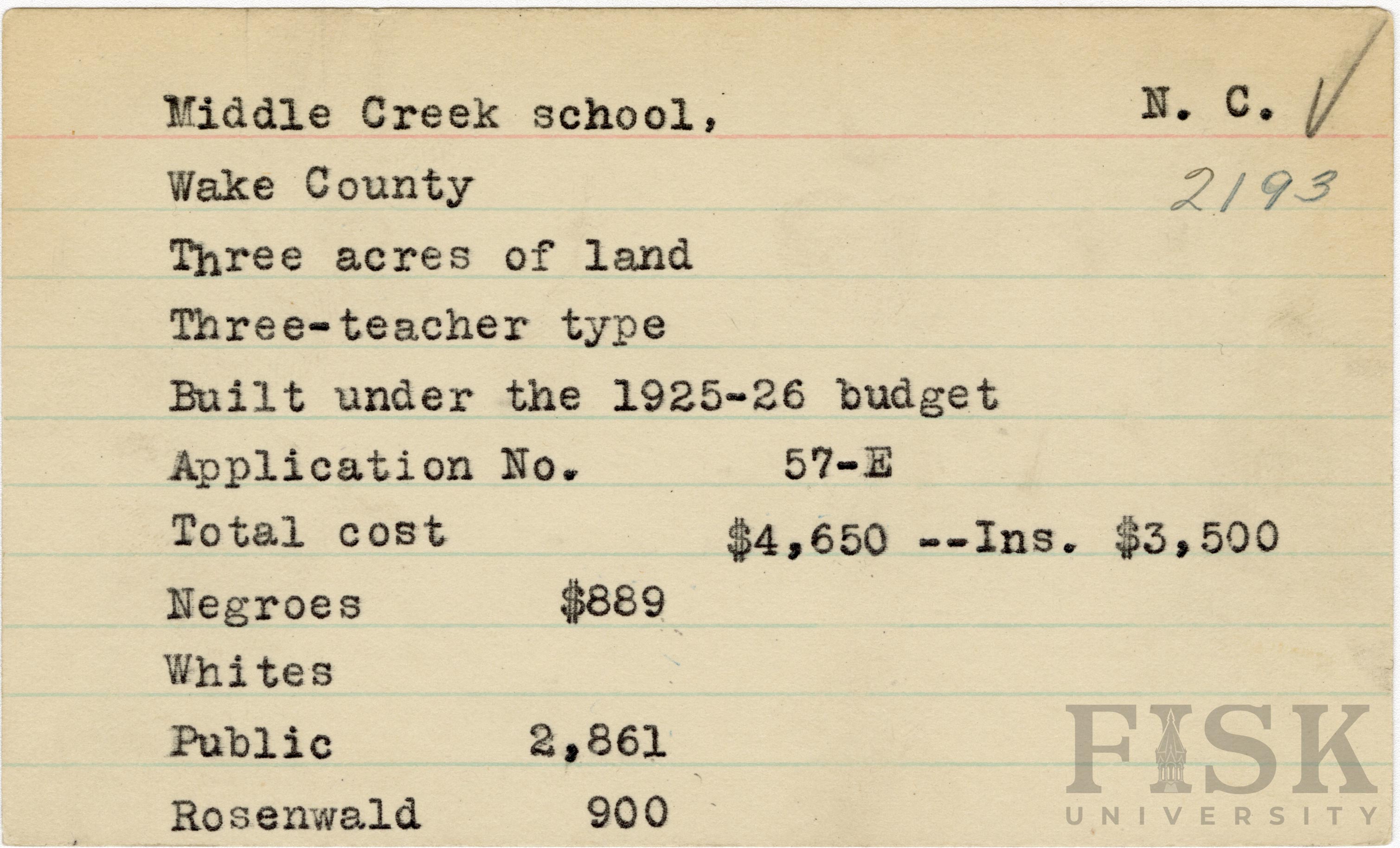 - Julius Rosenwald Fund--Buildings, African American schools--History--20th century, African American schools--Middle Creek School