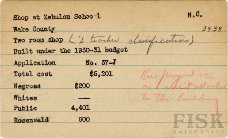 - School card for the two room shop at Zebulon School in Wake County, North Carolina with a handwritten note on the card that says, "This project is a [unclear] attached to the building"