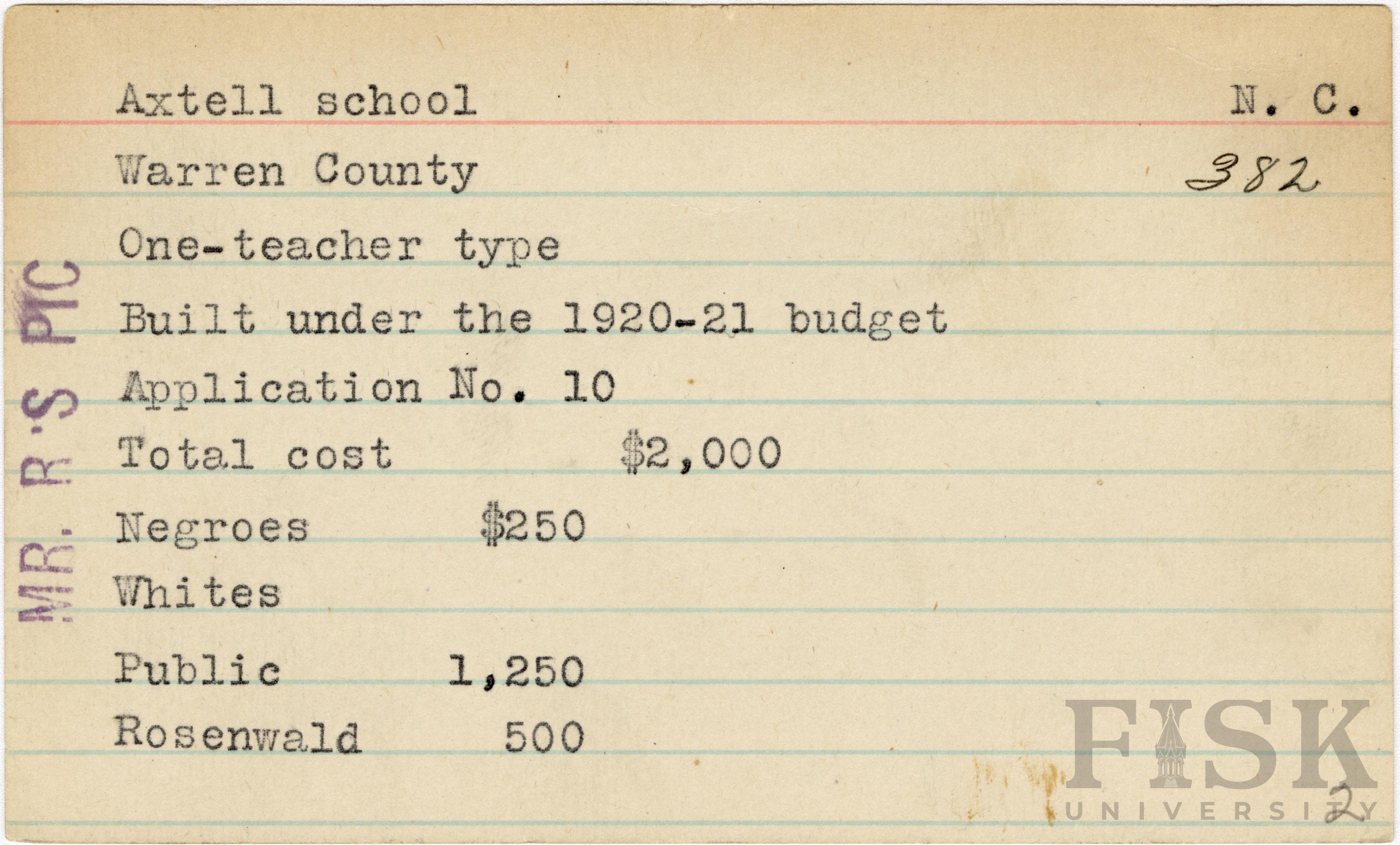 School card for Axtell School in Warren County, North Carolina with a note on the far left of the card that says, "Mr. R's Pic"