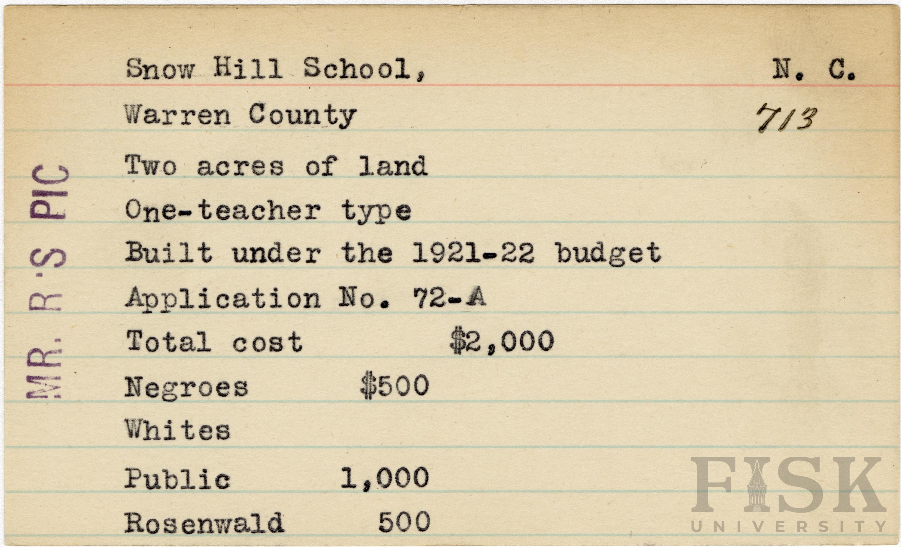 School card for Snow Hill School in Warren County, North Carolina with a note on the far left of the card that says, "Mr. R's Pic"