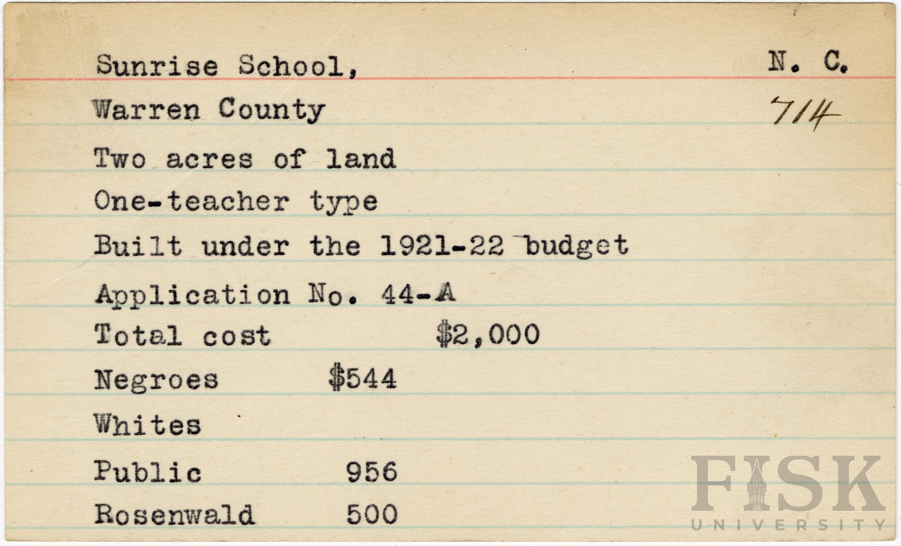 - School card for Sunrise School in Warren County, North Carolina