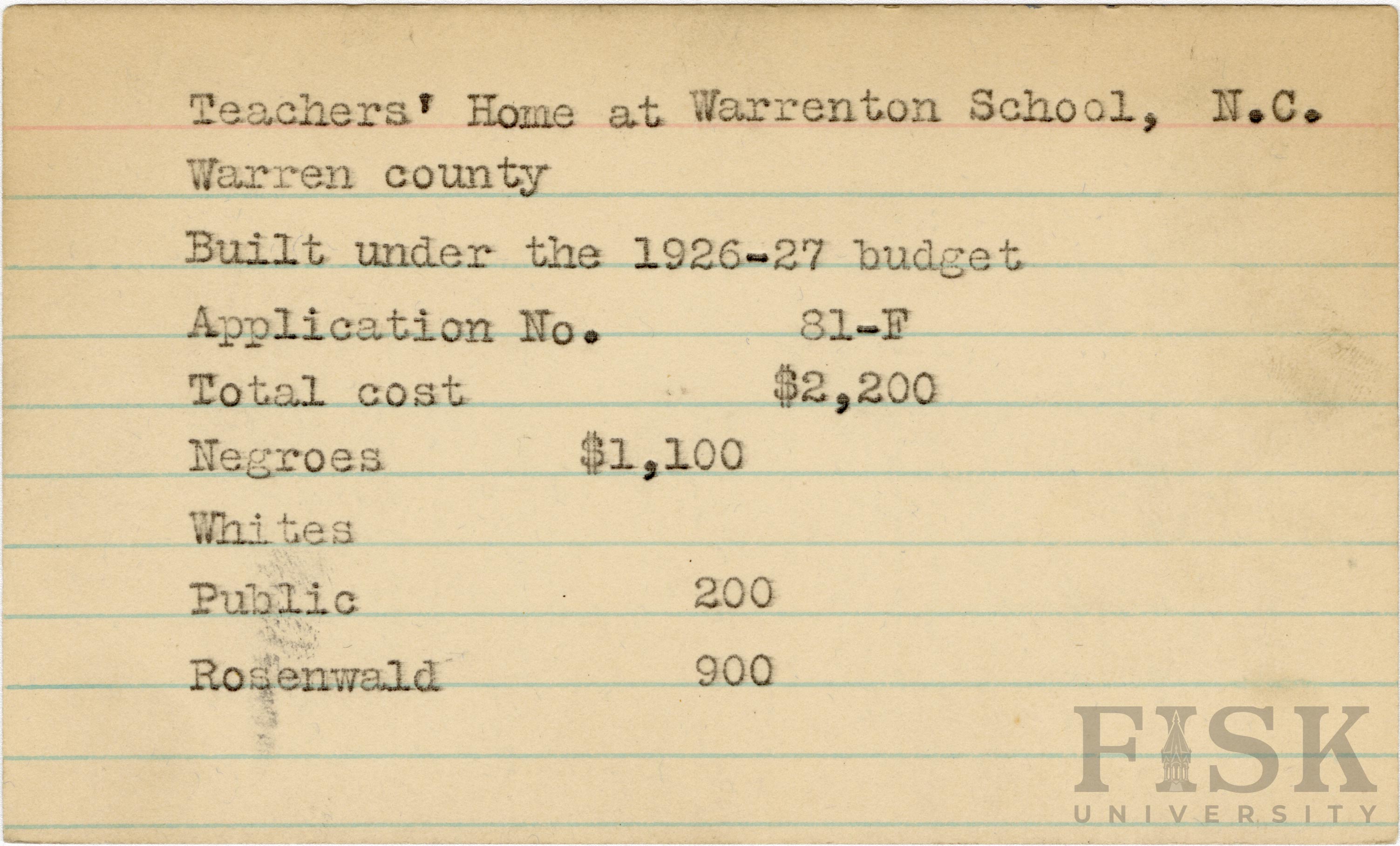 School card for the teacher's home at Warrenton School in Warren County, North Carolina