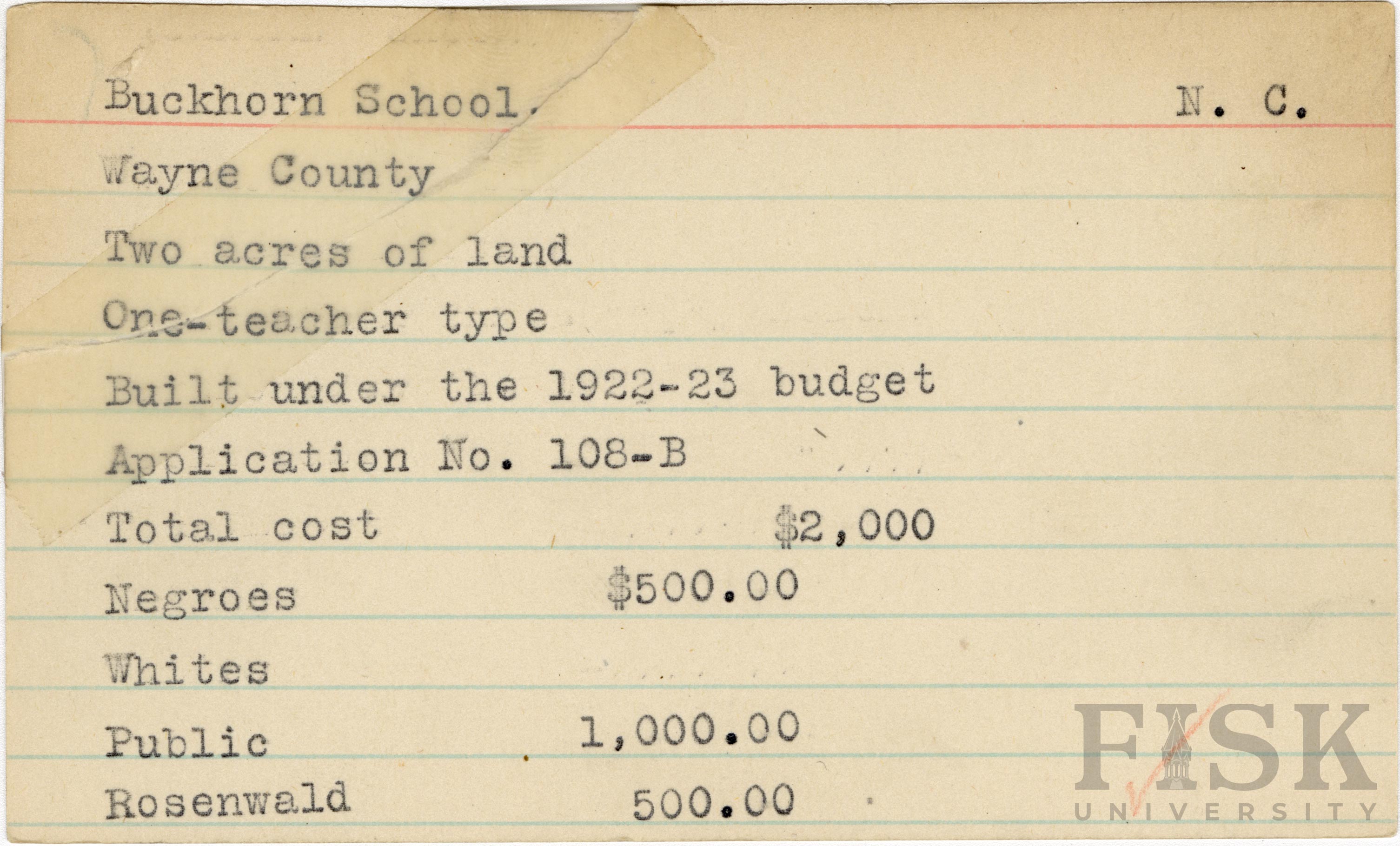 School card for Buckhorn School in Wayne County, North Carolina