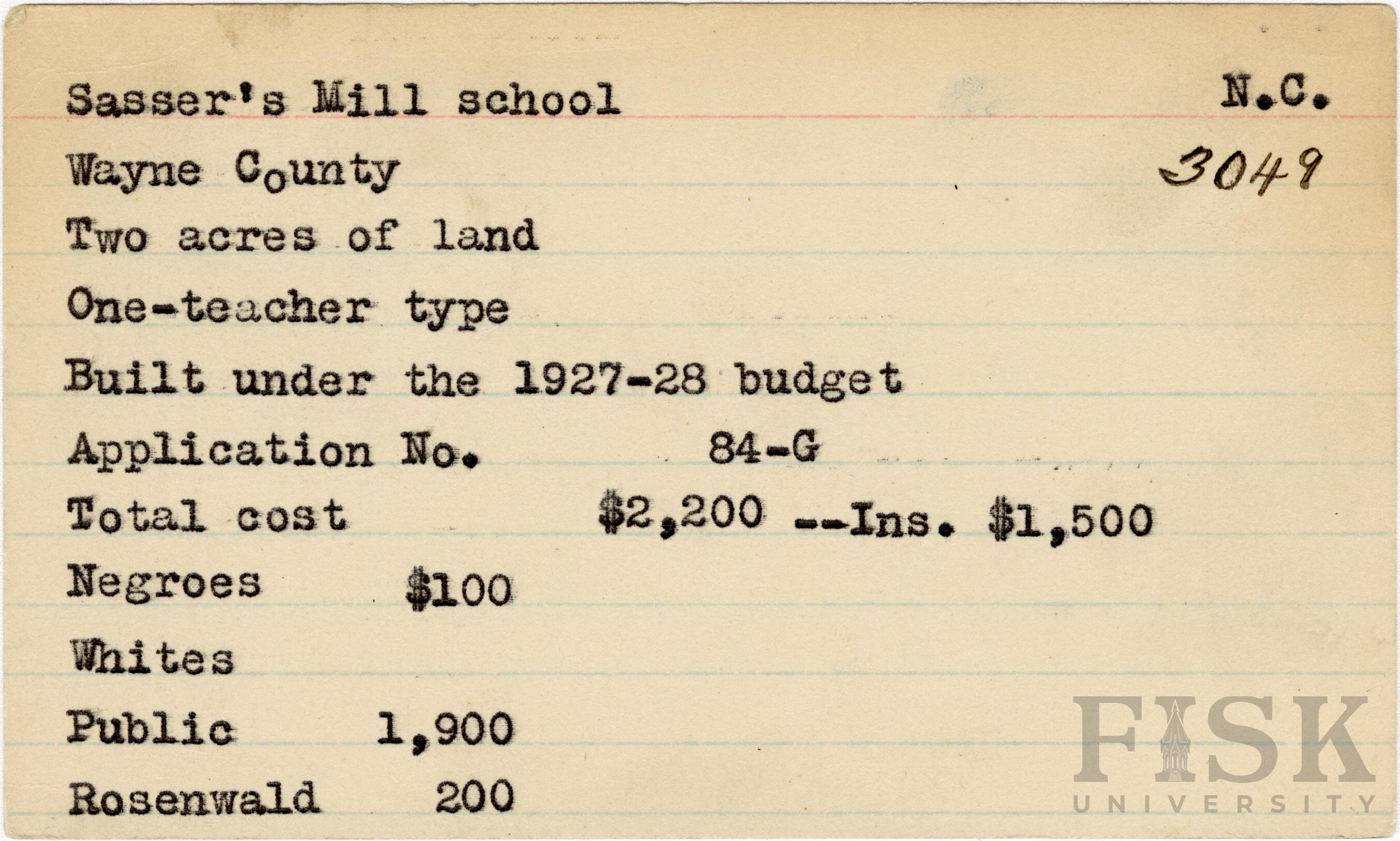- School card for Sasser's Mill School in Wayne County, North Carolina with a section added to the budget contributions that says, "Ins. $1,500"