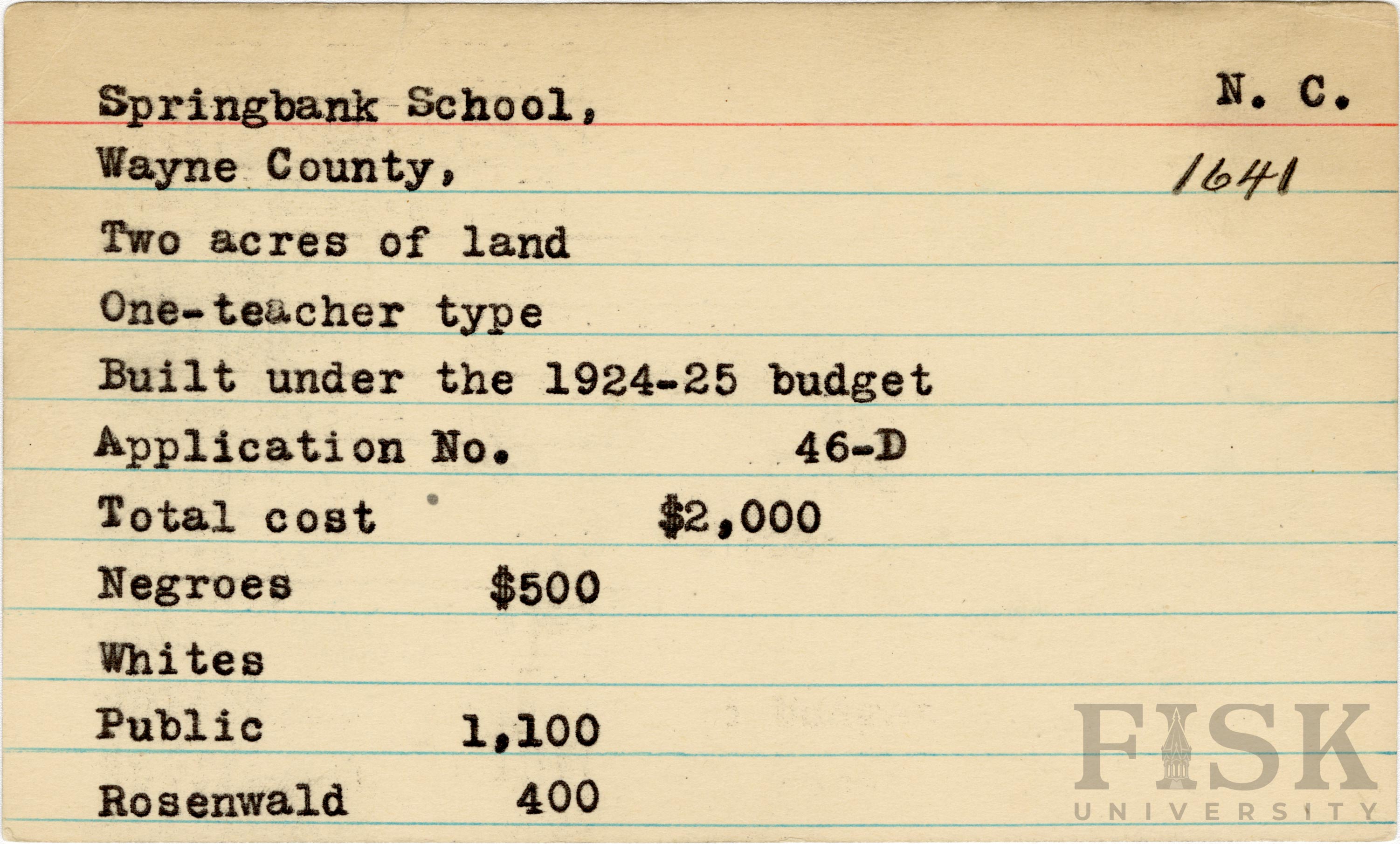 School card for Springbank School in Wayne County, North Carolina