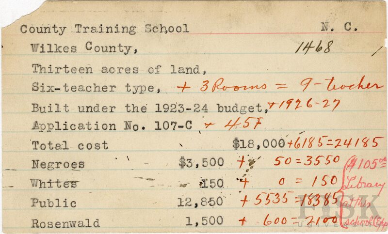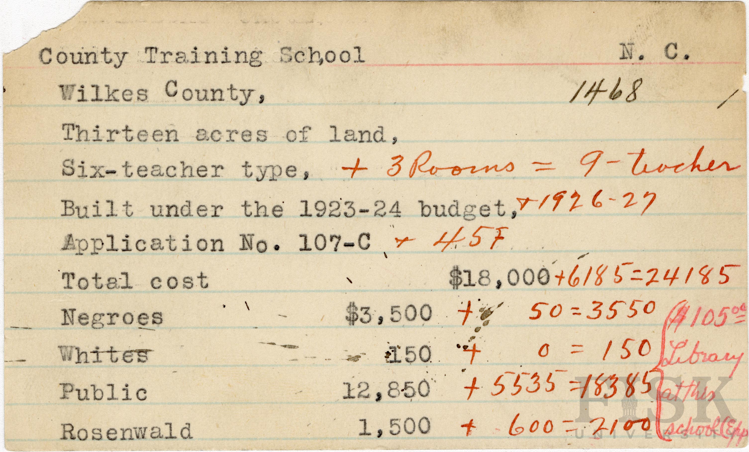 School card for County Training School in Wilkes County, North Carolina with handwritten additions to the teacher type, budget year, application number, and budget contribution sections. A handwritten note on the card that says, "$105.00 library at this school (Exp)"