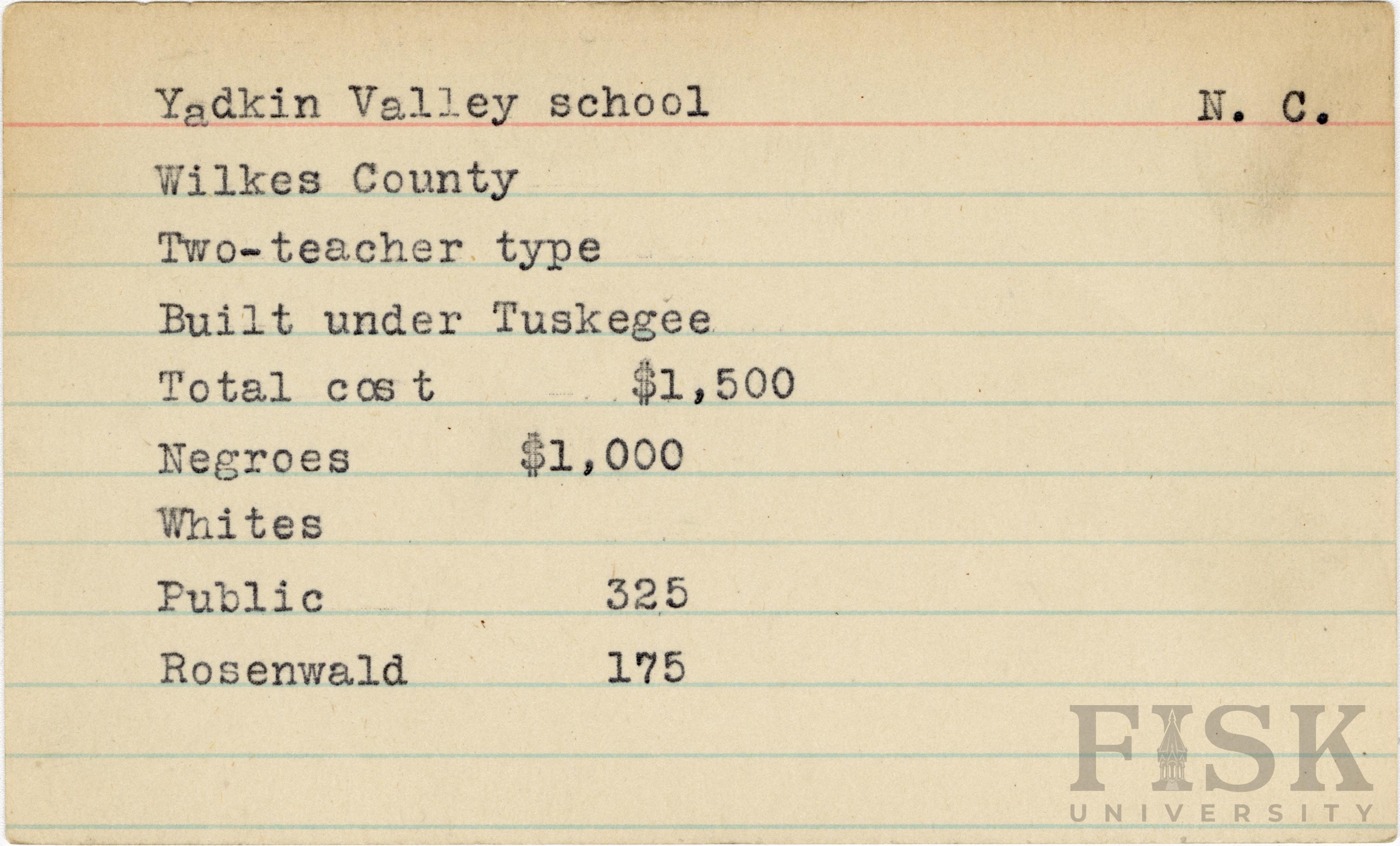 - Julius Rosenwald Fund--Buildings, African American schools--History--20th century, African American schools--Yadkin Valley School