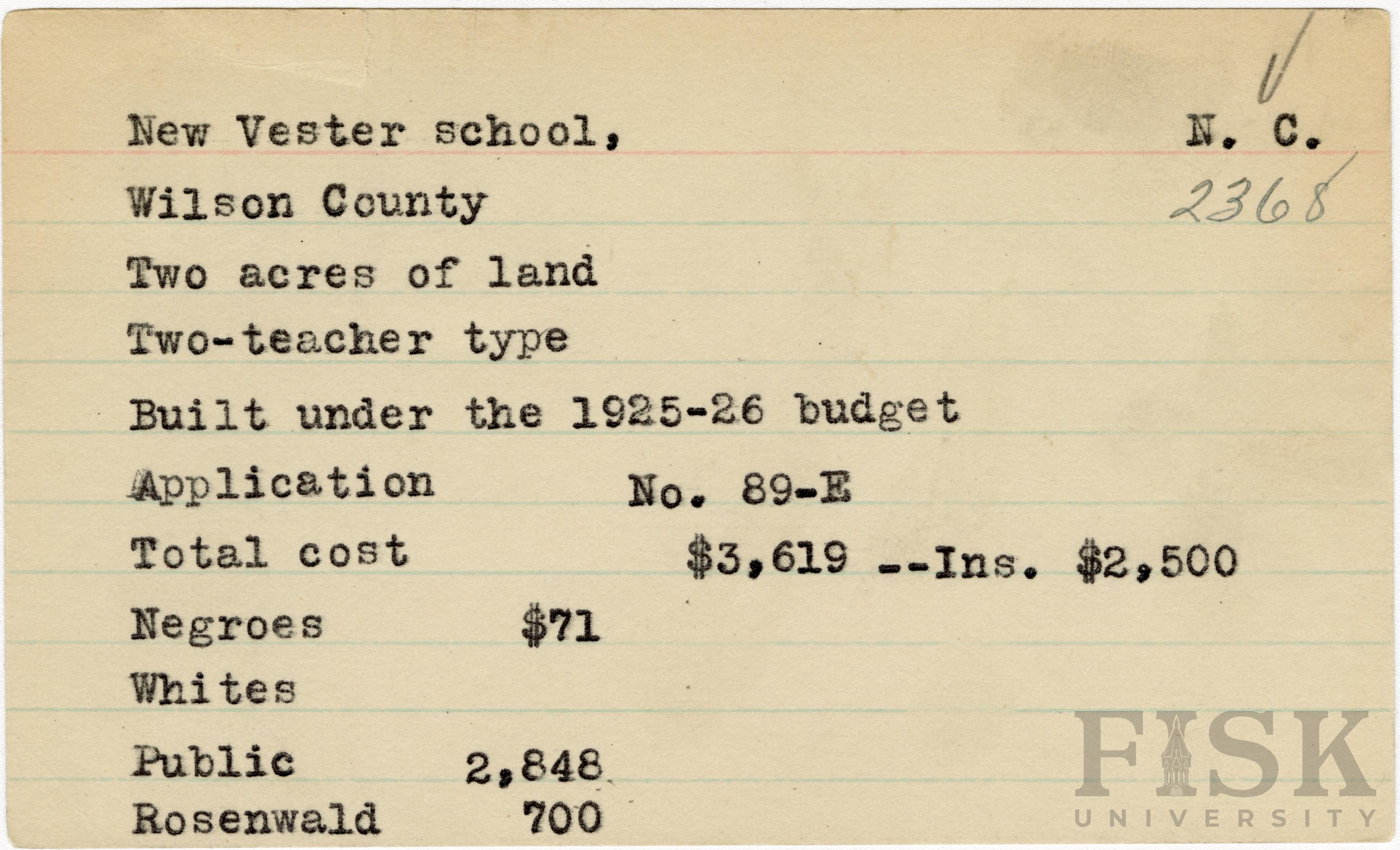 - School card for New Vester School in Wilson County, North Carolina with a section added to the budget contributions that says, "Ins. $2,500"