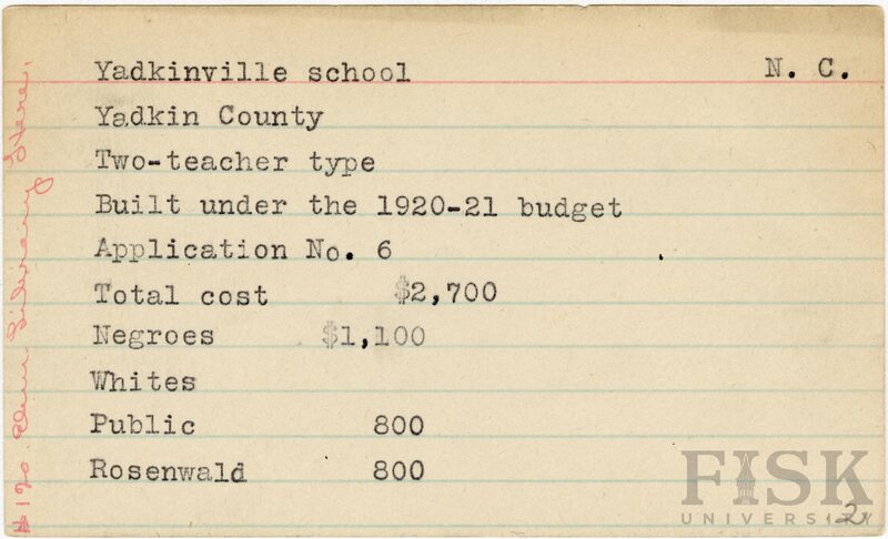 - Julius Rosenwald Fund--Buildings, African American schools--History--20th century, African American schools--Yadkinville School