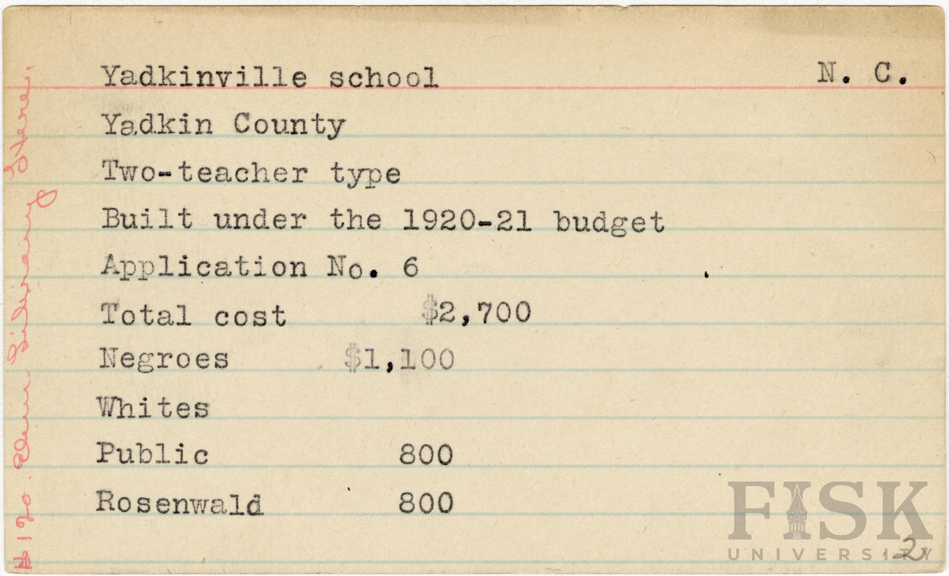 - School card for Yadkinville School in Yadkin County, North Carolina with a handwritten note on the card that says, "$120 elem library here"