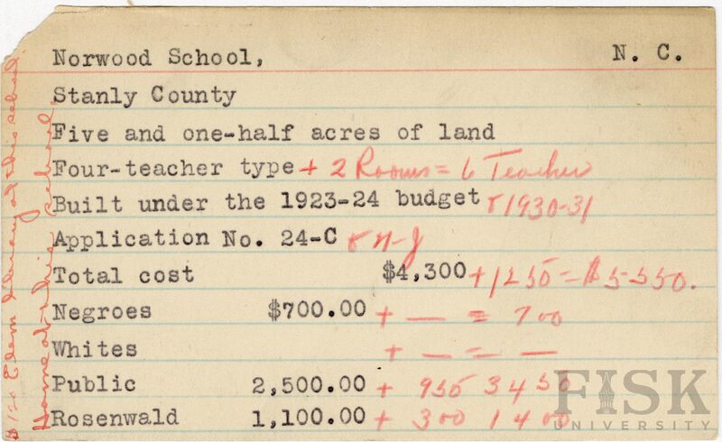 - School card for Norwood School in Stanly County, North Carolina with handwritten additions to the teacher type, budget year, application number, and budget contribution sections. Notes on the card say, "$120 elem library at this school" and "Home at this school"