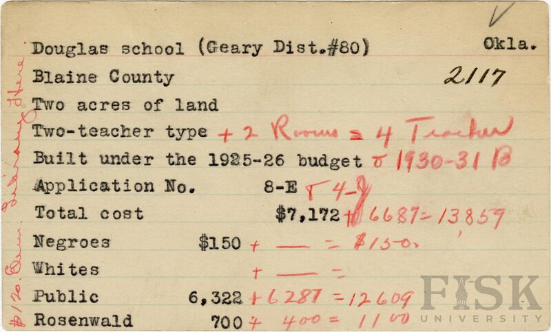 - School card from Rosenwald Fund for Douglas School in Blaine County, Oklahoma with handwritten additions to the teacher type and budget. A note on the left says, "$120 Elem. Library Here."