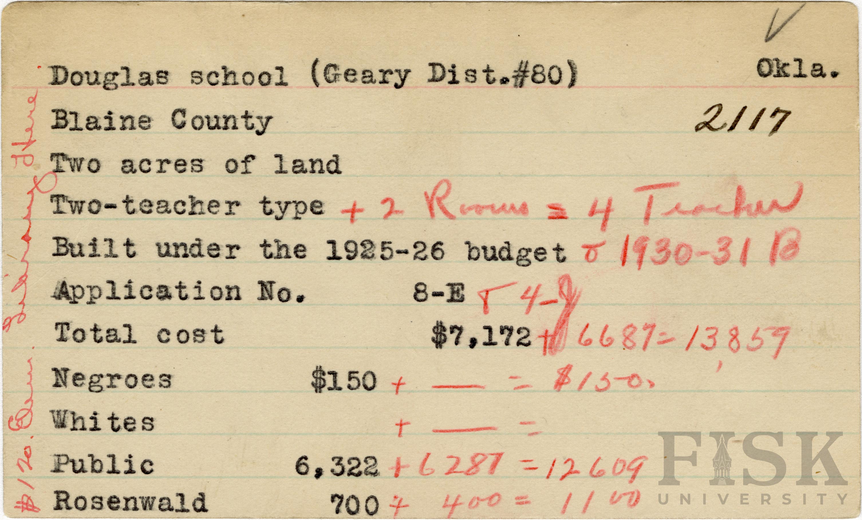 School card from Rosenwald Fund for Douglas School in Blaine County, Oklahoma with handwritten additions to the teacher type and budget. A note on the left says, "$120 Elem. Library Here."