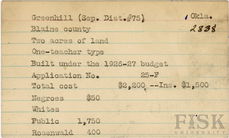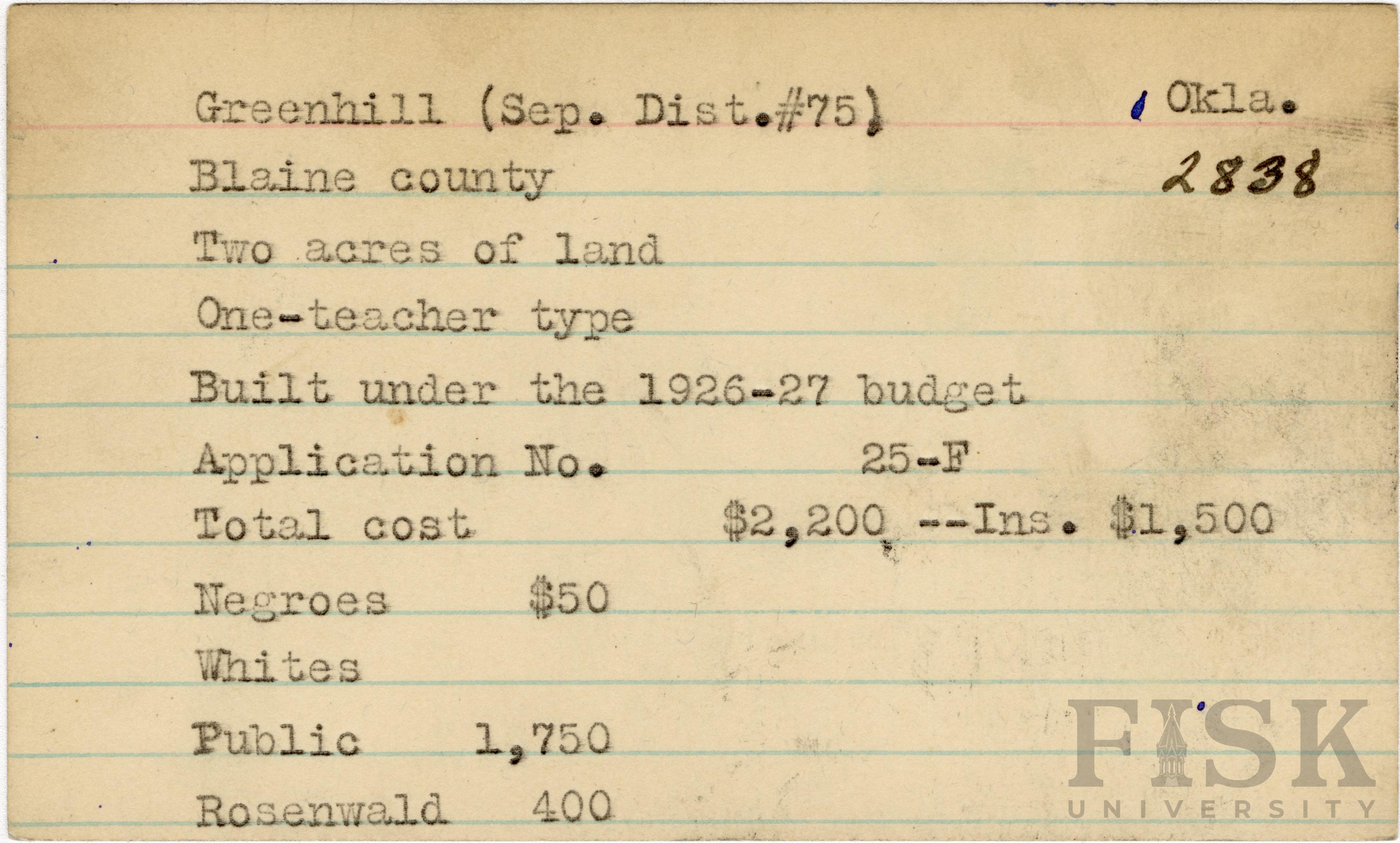 - School card from Rosenwald Fund for Greenhill School in Blaine County, Oklahoma with a section added to the budget contribution that says, "Ins. $1,500"