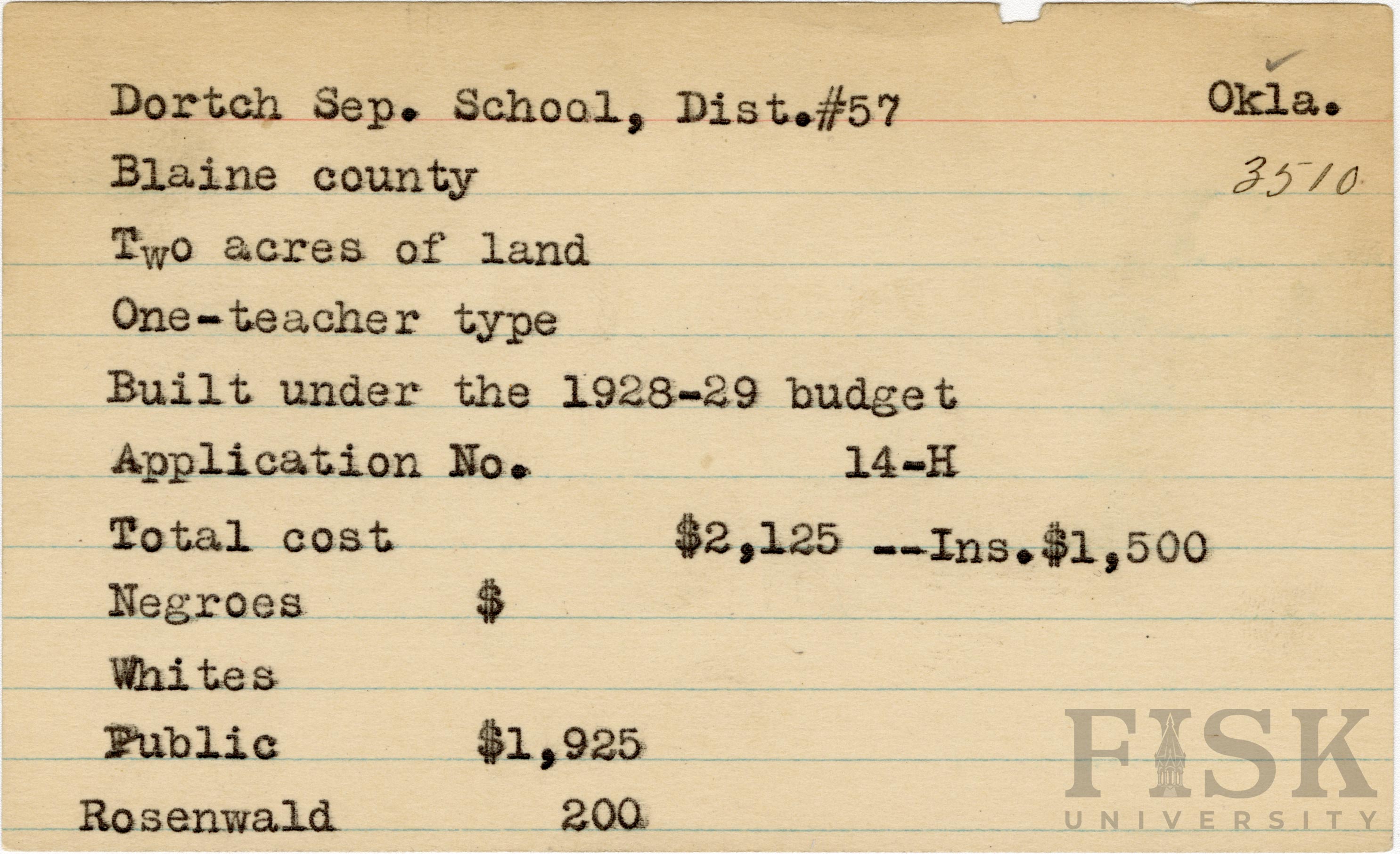 - School card from Rosenwald Fund for Dortch Sep. School, Dist. No. 57 in Blaine County, Oklahoma with a section added to the budget contribution that says, "Ins. $1,500"