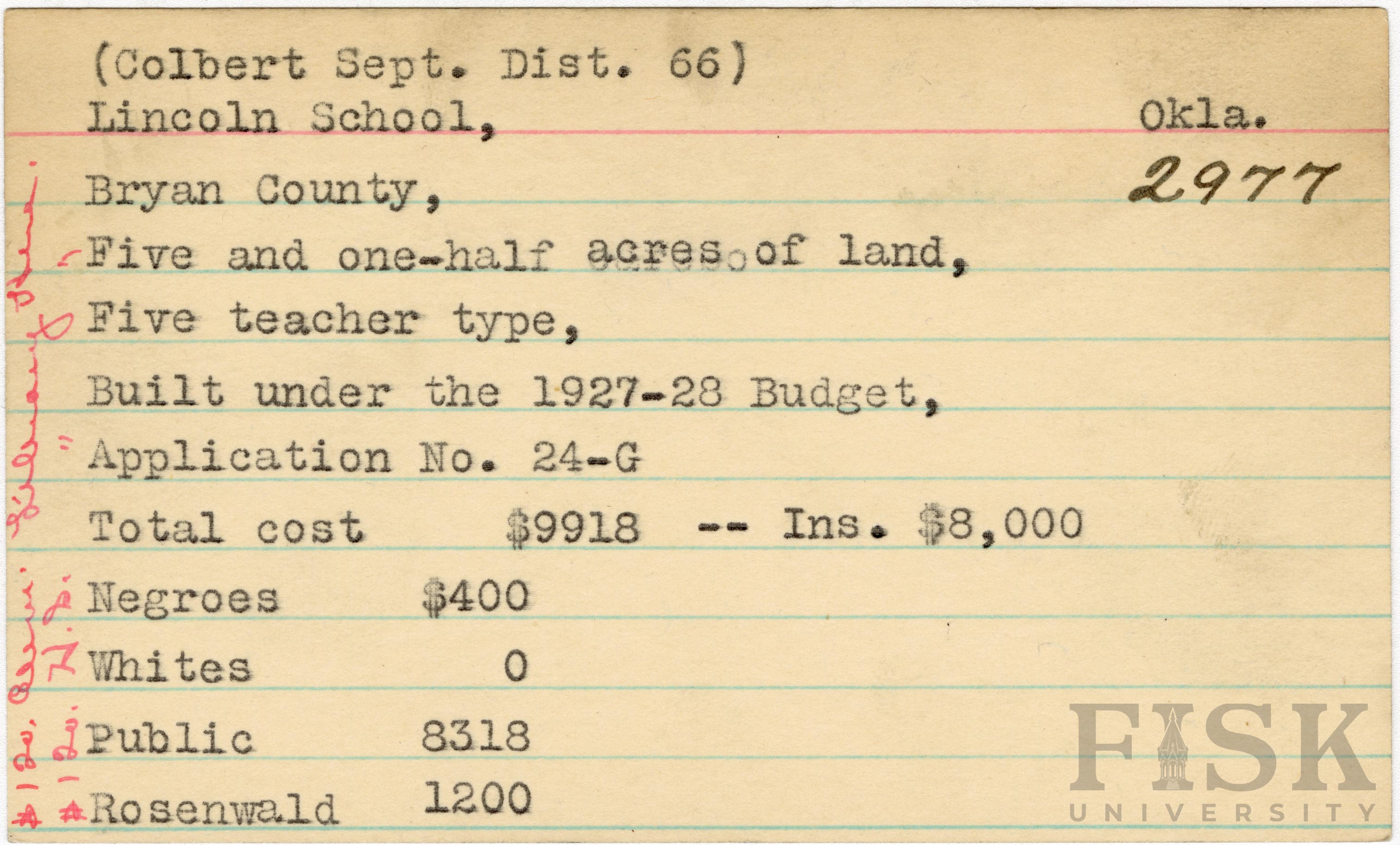 - School card from Rosenwald Fund for Lincoln School in Bryan County, Oklahoma with a section added to the budget contributions that says, "Ins. $8,000" with a handwritten note on the left that says, "$120 Elem. Library Here" and below, "$120 H.S. " " "