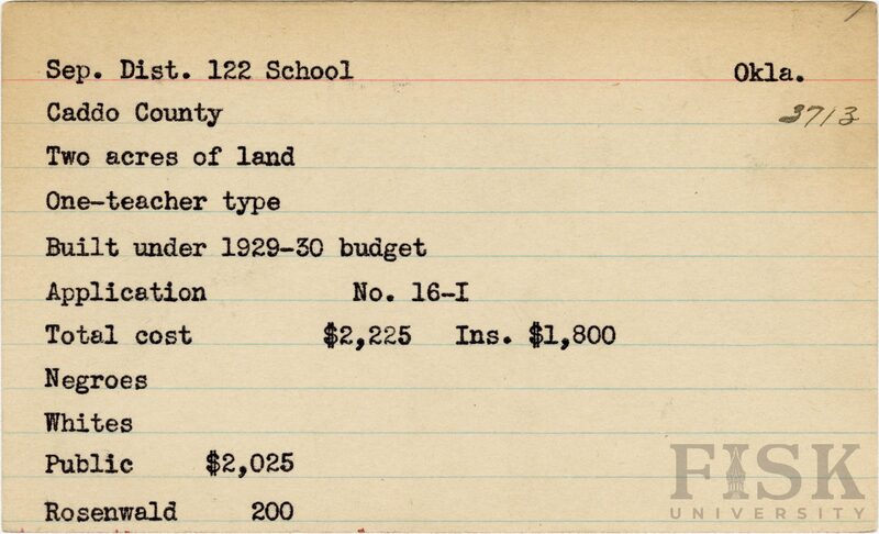 - School card from Rosenwald Fund for Sep. Dist. No. 122 School in Caddo County, Oklahoma with a section added to the budget contributions that says, "Ins. $1,800"