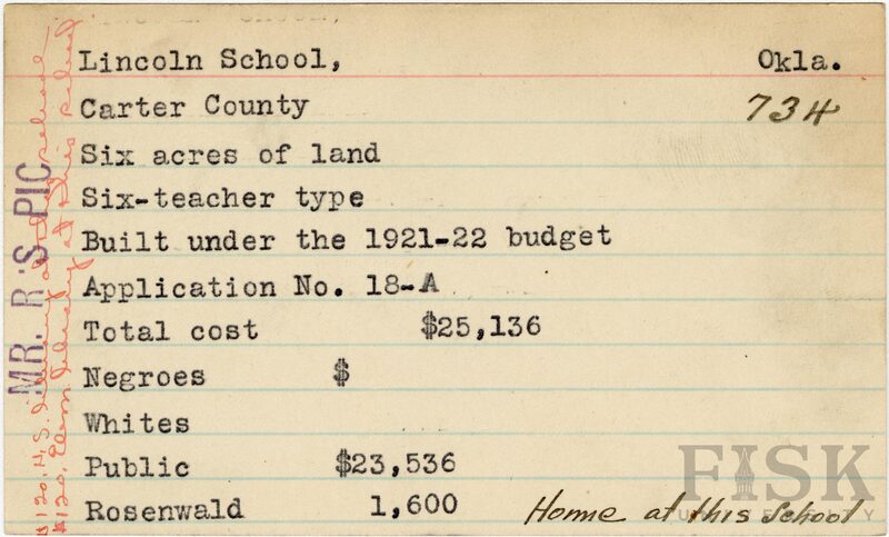 - School card from Rosenwald Fund for Lincoln School in Carter County, Oklahoma with handwritten notes on the card that say, "Home at this school," "Mr. R's Pic," "$120 H.S. library at this school," "$120 elem library at this school"