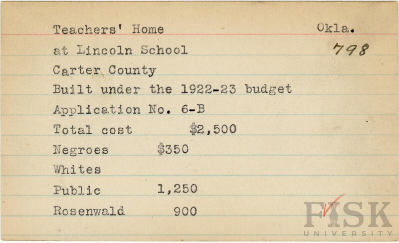 - School card from Rosenwald Fund for the teacher's home at Lincoln School in Carter County, Oklahoma