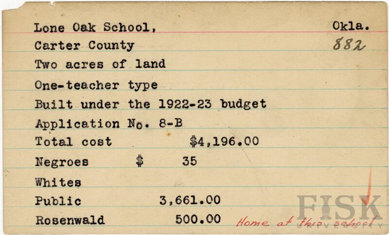 School card from Rosenwald Fund for Lone Oak School in Carter County, Oklahoma with a handwritten note on the card that says, "Home at this school"