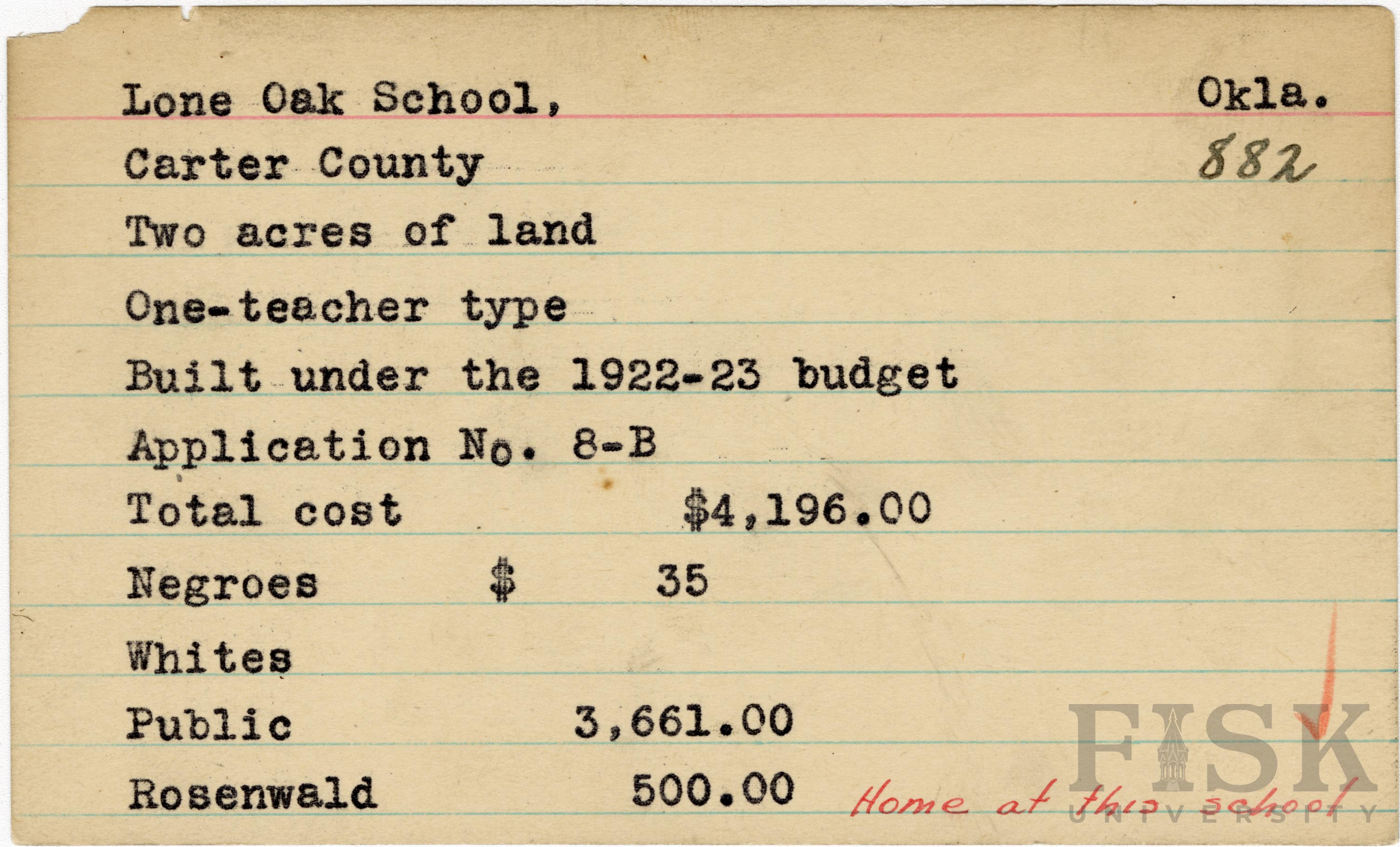 - School card from Rosenwald Fund for Lone Oak School in Carter County, Oklahoma with a handwritten note on the card that says, "Home at this school"
