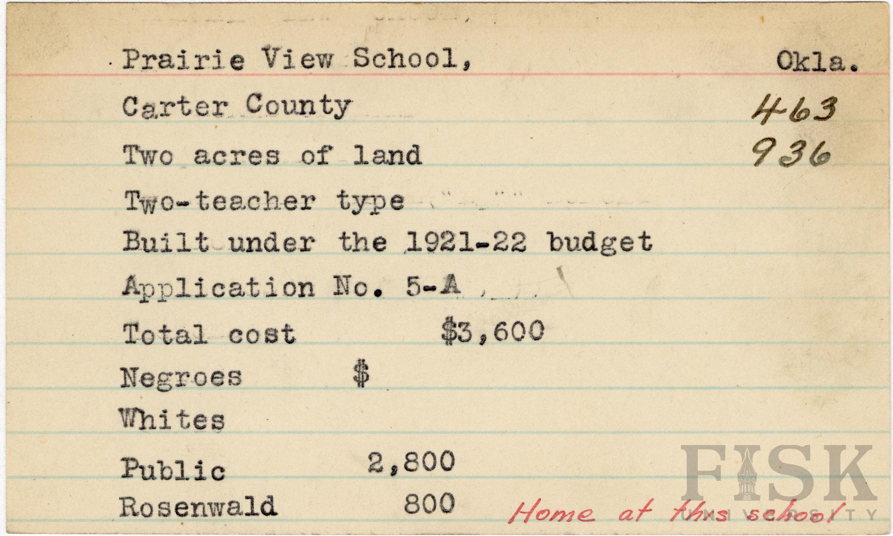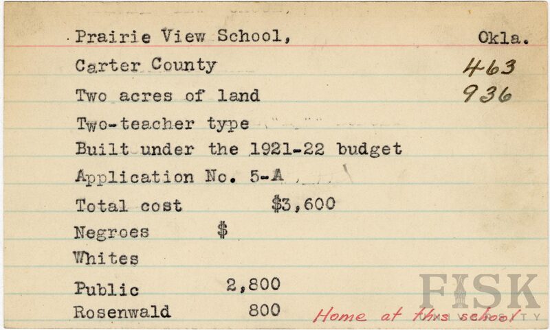 - School card from Rosenwald Fund for Prairie View School in Carter County, Oklahoma with a handwritten note on the card that says, "Home at this school"