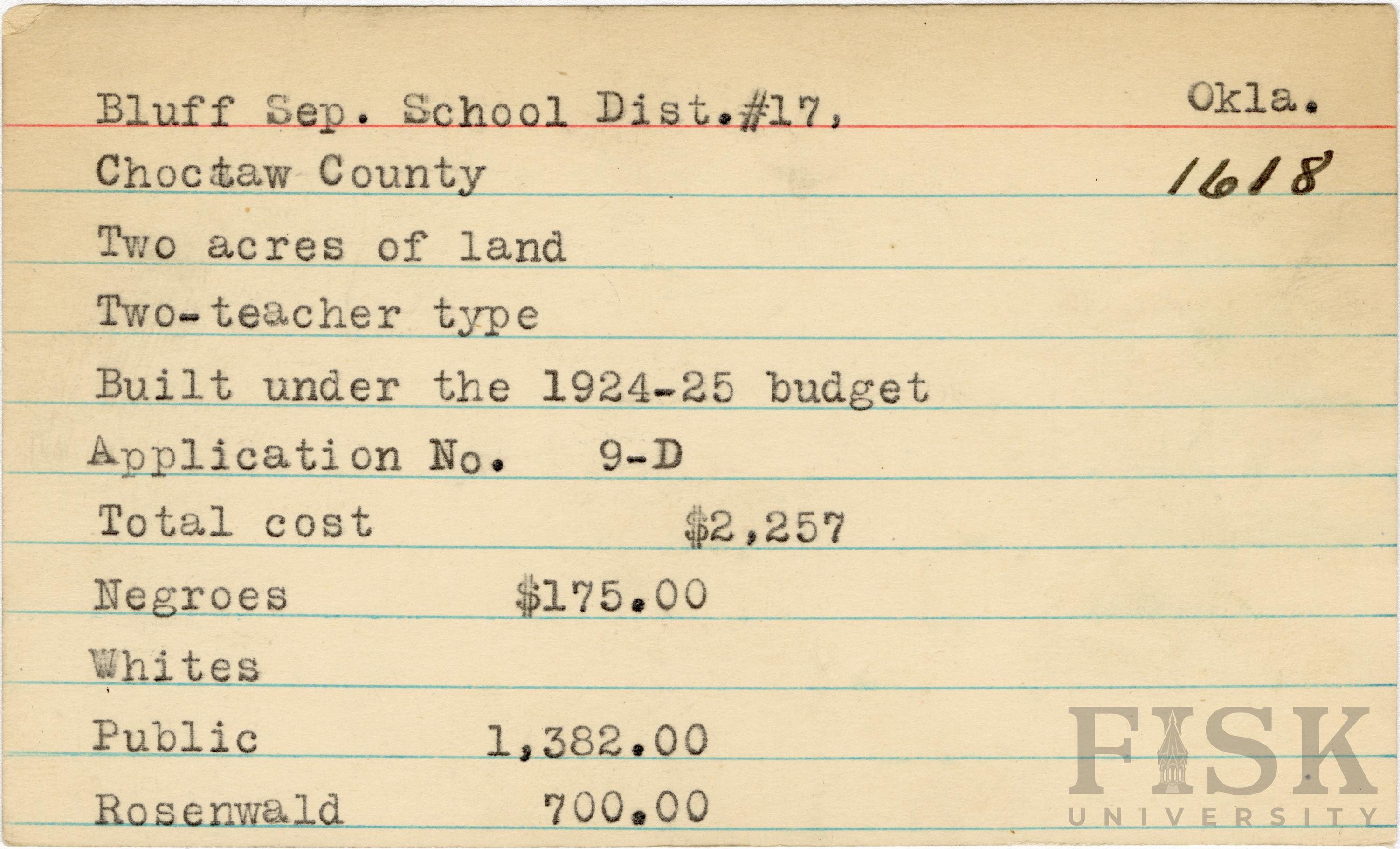 - School card from Rosenwald Fund for Bluff Sep. School Dist. No. 17 in Choctaw County, Oklahoma
