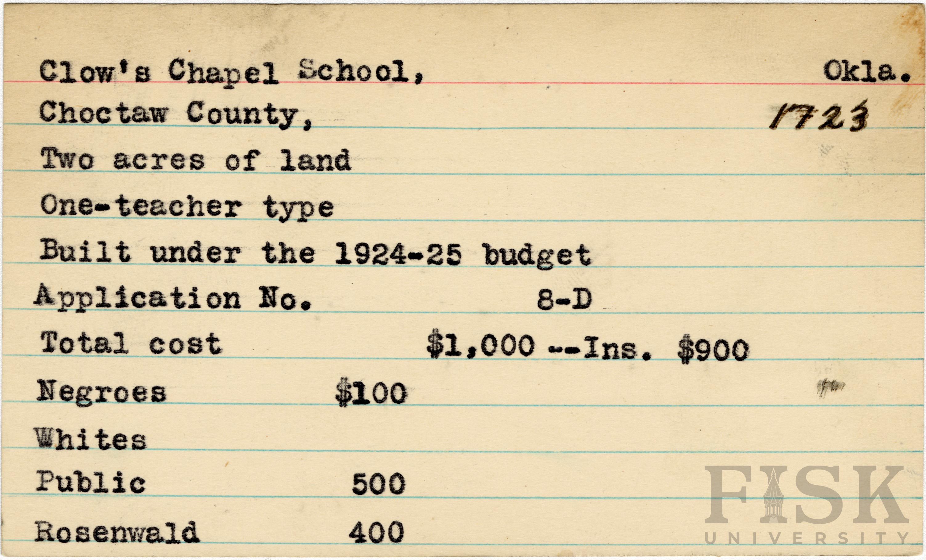 - School card from Rosenwald Fund for Clow's Chapel School in Choctaw County, Oklahoma with a section added to the budget contributions that says, "Ins. $900"