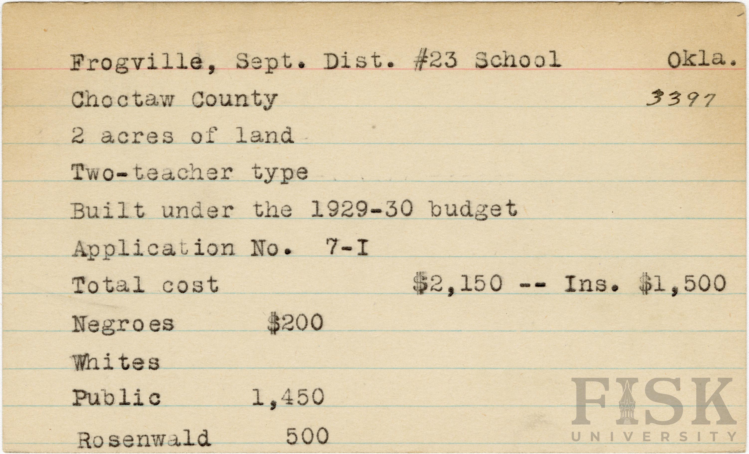 - School card from Rosenwald Fund for Frogville, Sept. Dist. No. 23 School in Choctaw County, Oklahoma with a section added to the budget contributions that says, "Ins. $1,500"