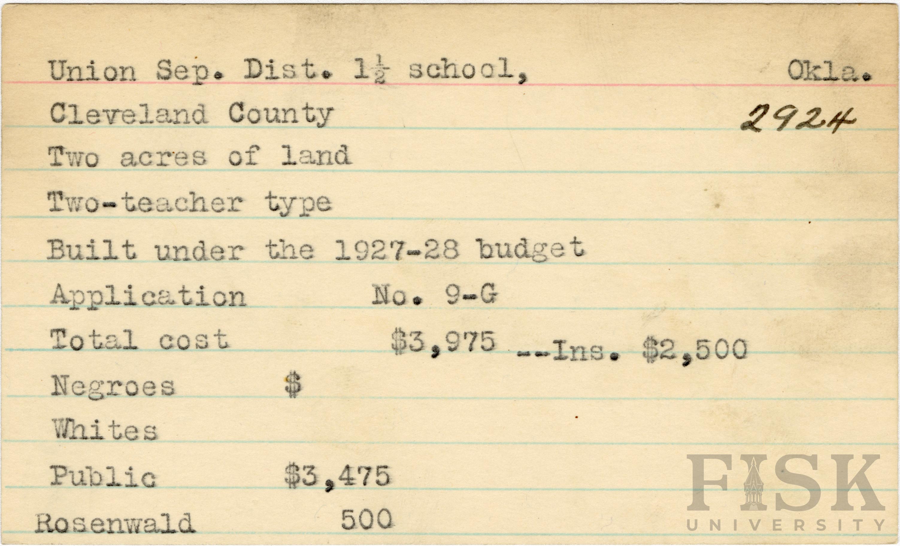 - School card from Rosenwald Fund for Union Sep. Dist. 1.5 School in Cleveland County, Oklahoma with a section added to the budget contributions that says, "Ins. $2,500"