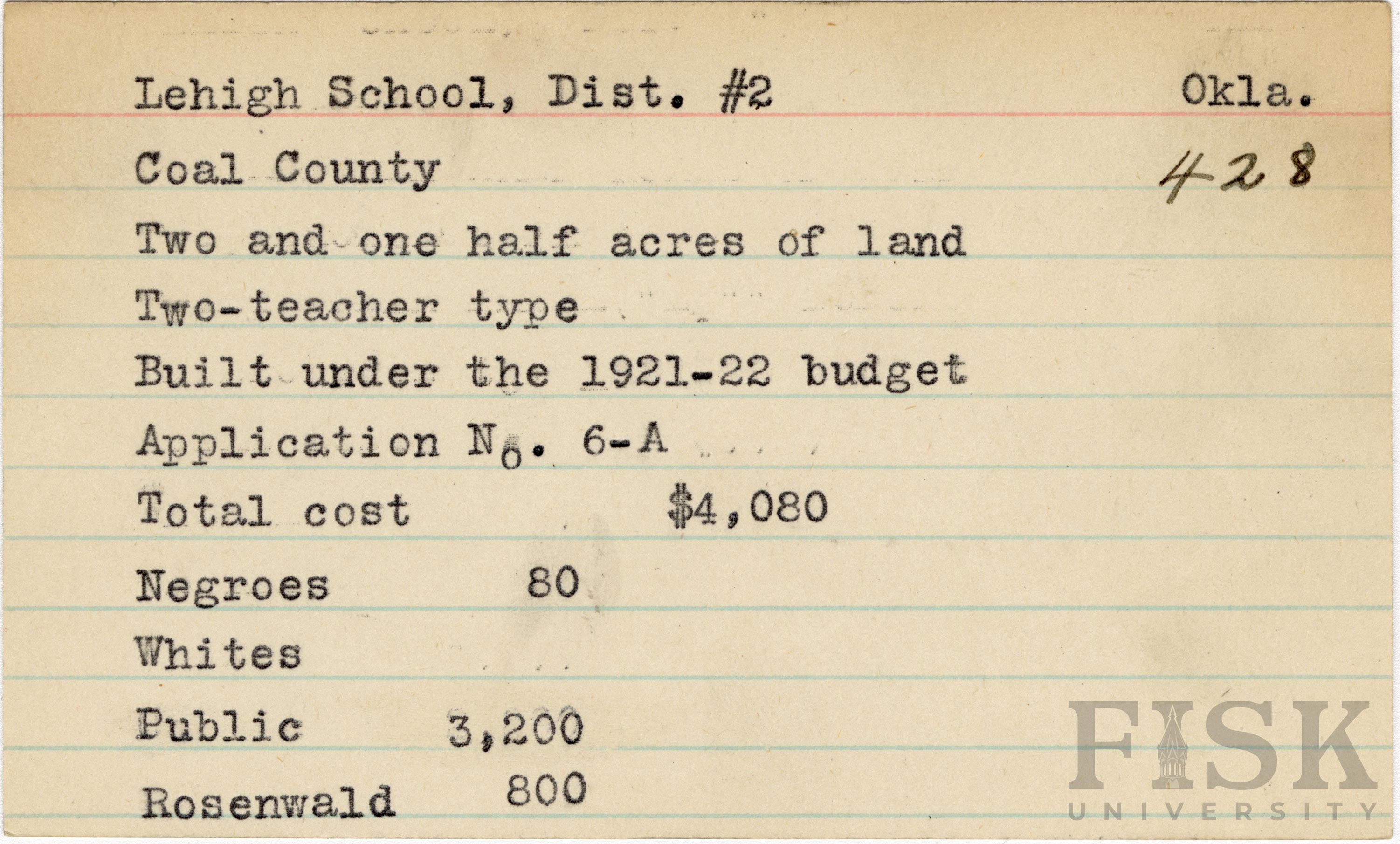 - School card from Rosenwald Fund for Lehigh School, Dist. No. 2 in Coal County, Oklahoma