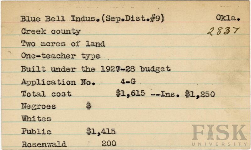- School card from Rosenwald Fund for Blue Bell Industrial School in Creek County, Oklahoma with a section added to the budget contributions that says, "Ins. $1,250"