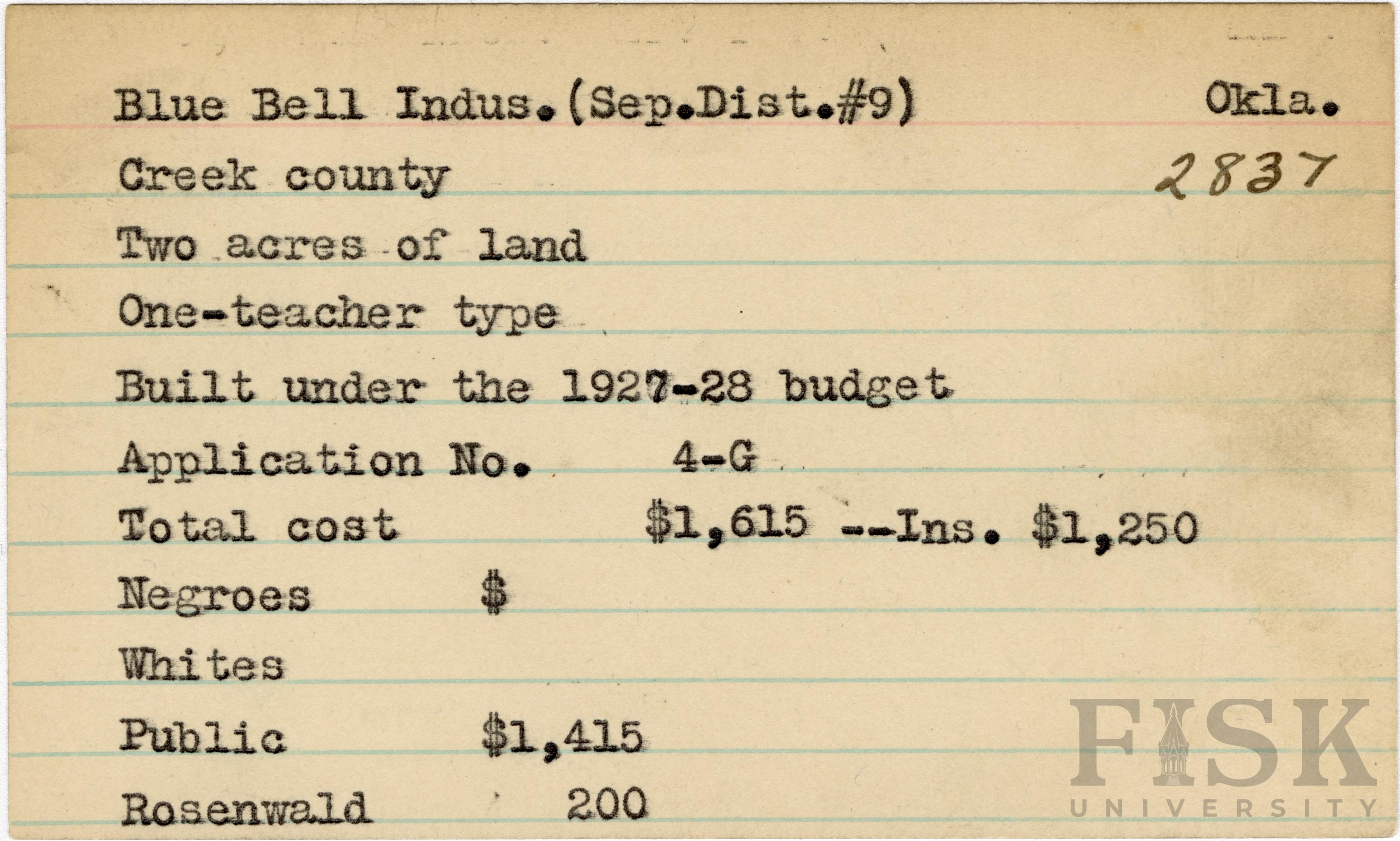 School card from Rosenwald Fund for Blue Bell Industrial School in Creek County, Oklahoma with a section added to the budget contributions that says, "Ins. $1,250"