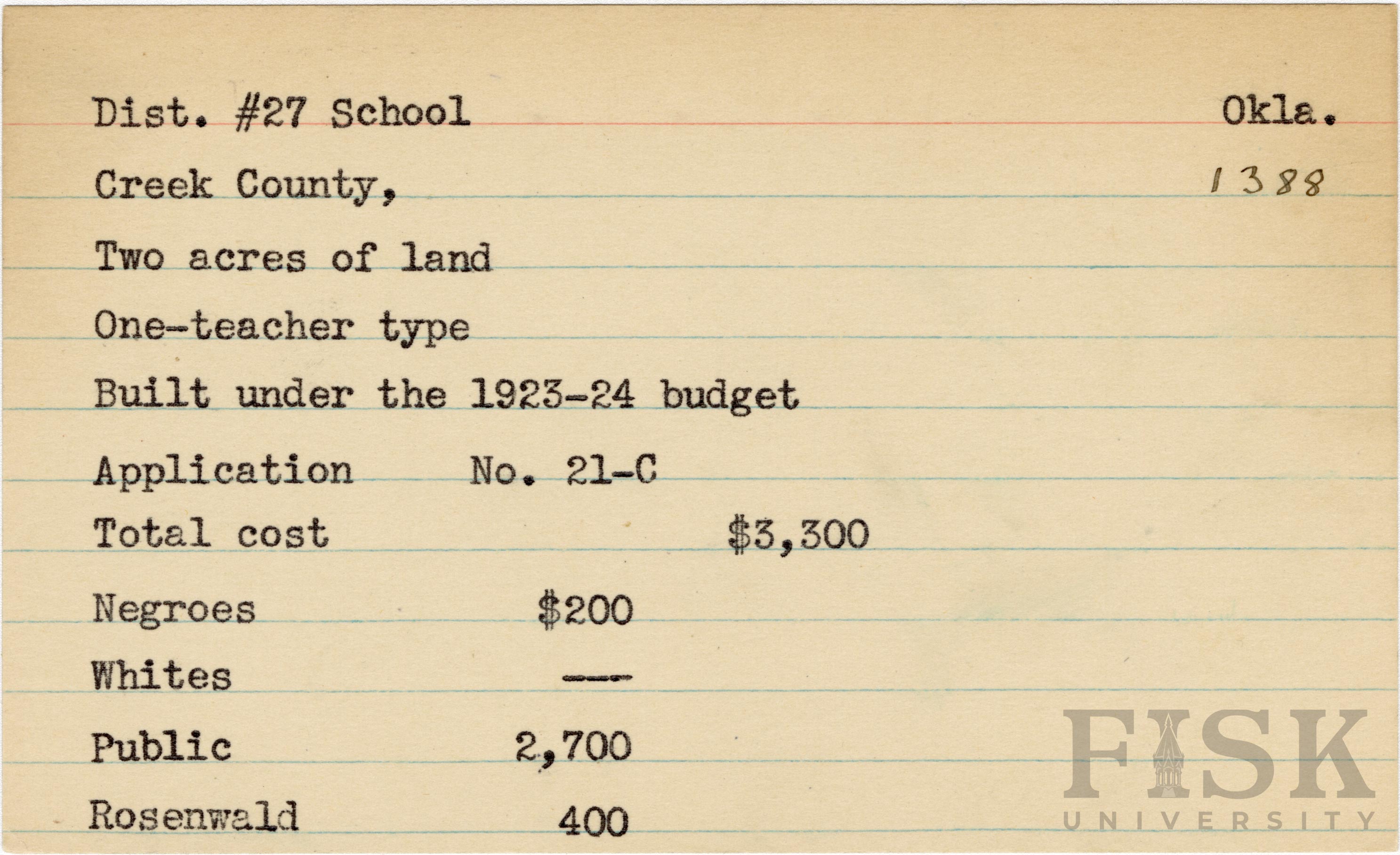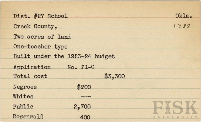- School card from Rosenwald Fund for Dist. No. 27 School in Creek County, Oklahoma