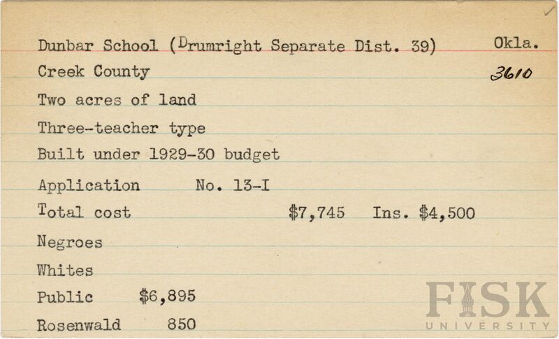- School card from Rosenwald Fund for Dunbar School in Creek County, Oklahoma with a section added to the budget contributions that says, "Ins. $4,500"