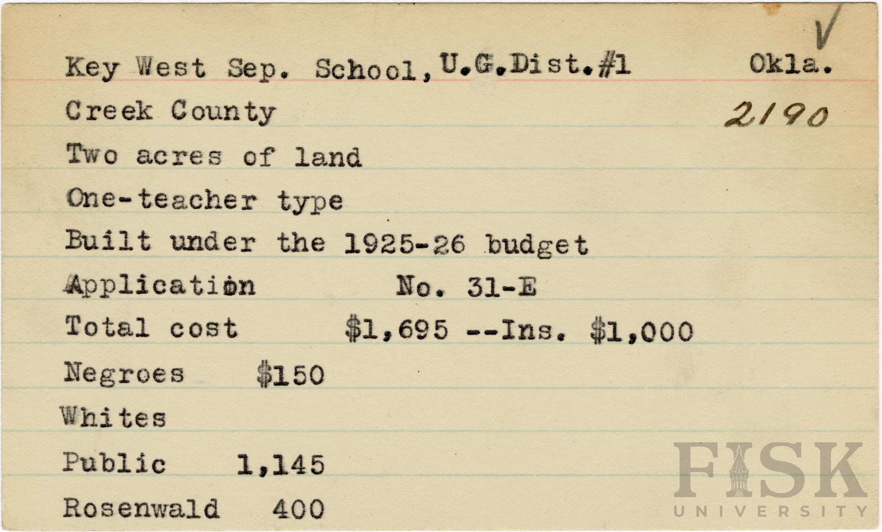 - School card from Rosenwald Fund for Key West Sep. School in Creek County, Oklahoma with a section added to the budget contributions that says, "Ins. $1,000"