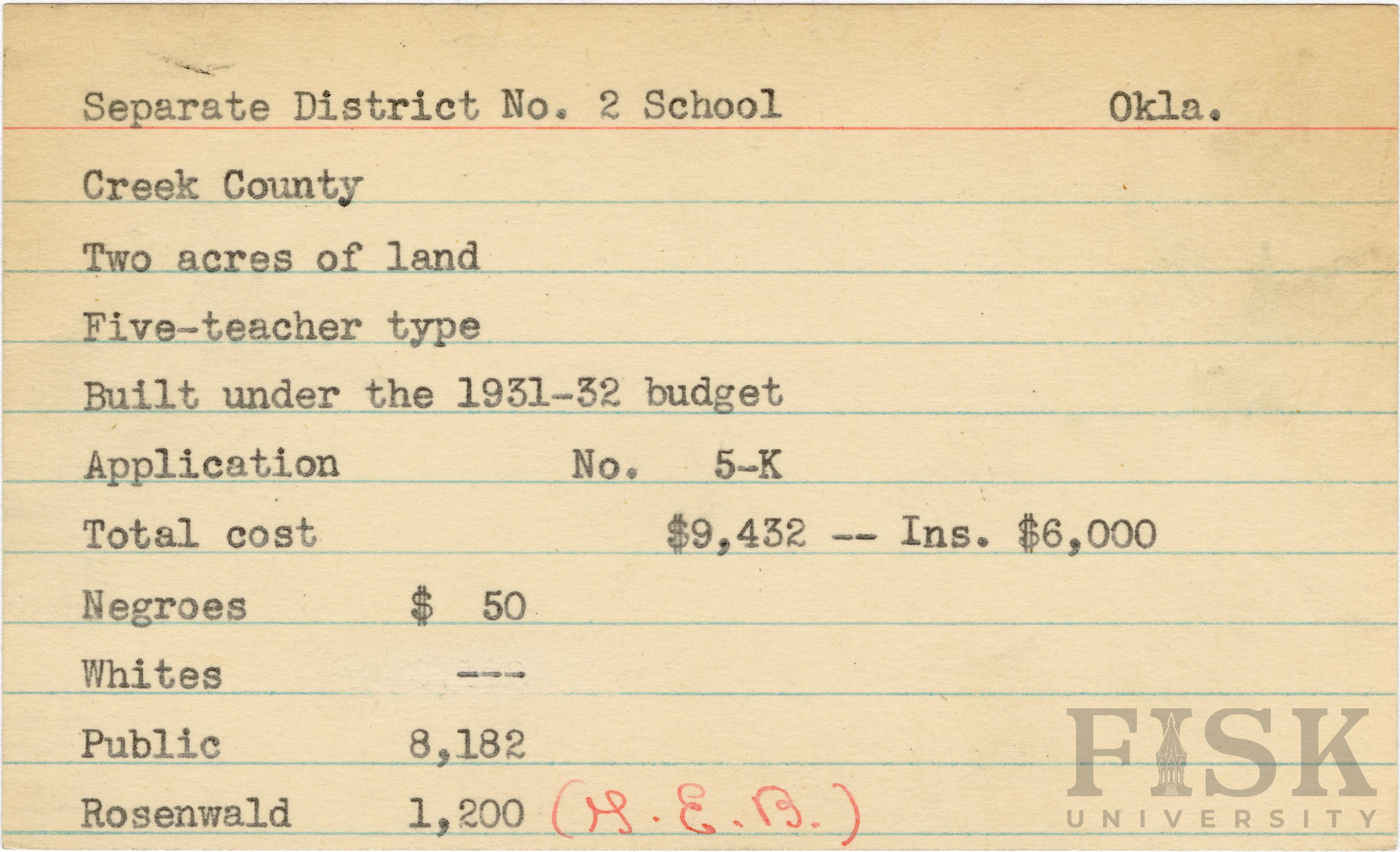 School card from Rosenwald Fund for Separate District No. 2 School in Creek County, Oklahoma with a section added to the budget contributions that says, "Ins. $6,000" and a handwritten addition next to the Rosenwald budget contribution says, "(G.E.B.)"