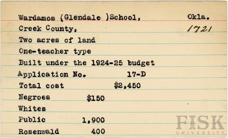 - School card from Rosenwald Fund for Wardamos School in Creek County, Oklahoma