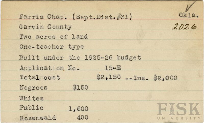 - School card from Rosenwald Fund for Farris Chap. School in Garvin County, Oklahoma with a section added to the budget contributions that says, "Ins. $2,000"