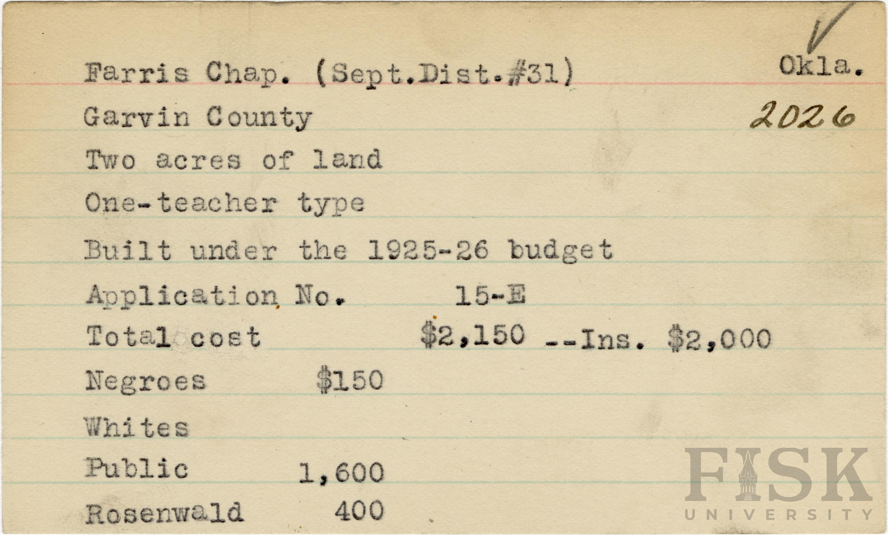 School card from Rosenwald Fund for Farris Chap. School in Garvin County, Oklahoma with a section added to the budget contributions that says, "Ins. $2,000"