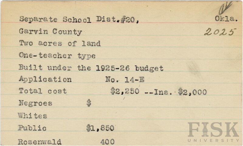 - School card from Rosenwald Fund for Separate School Dist. No. 20 in Garvin County, Oklahoma with a section added to the budget contributions that says, "Ins. $2,000"