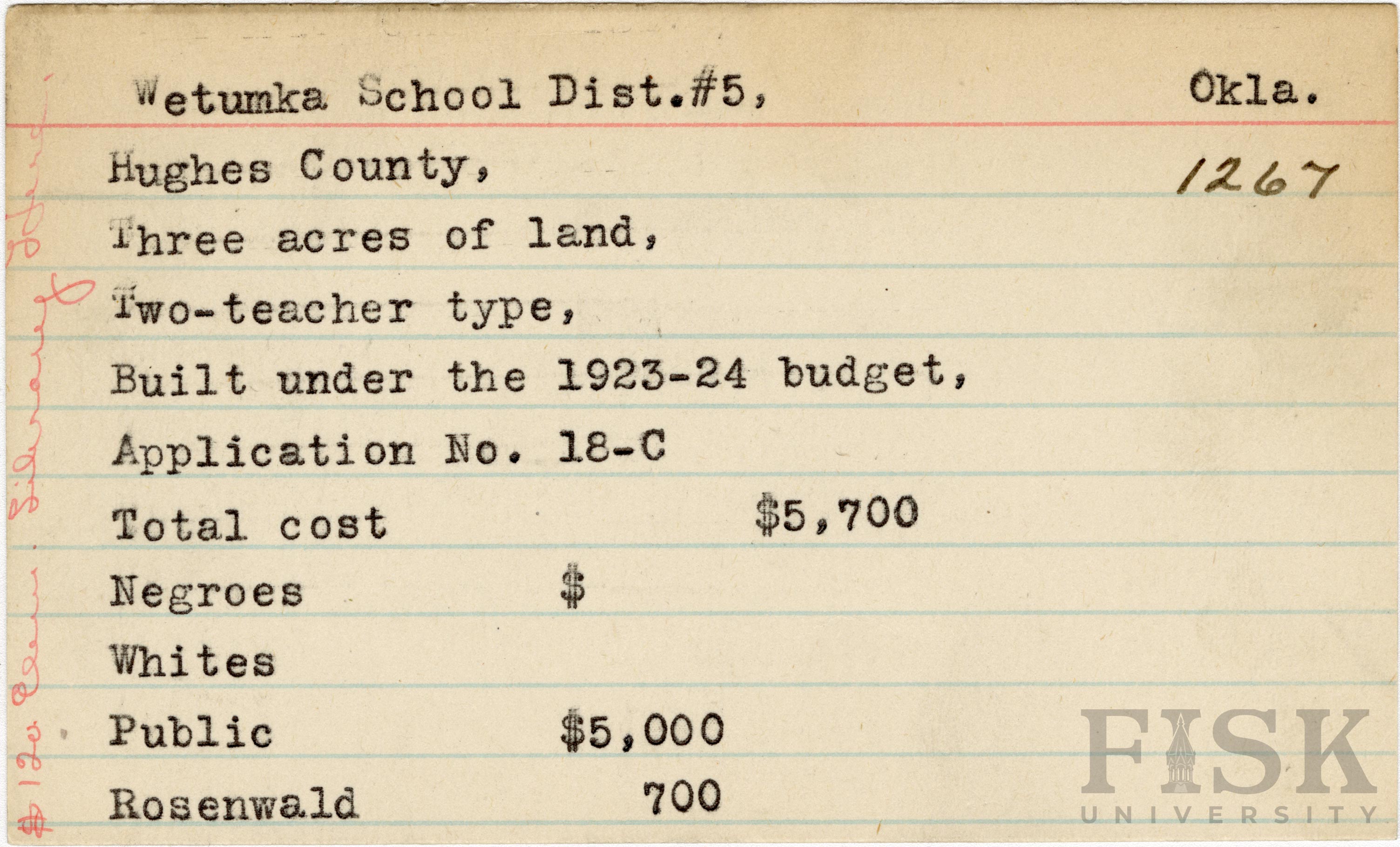 - School card from Rosenwald Fund for Wetumka School Dist. No. 5 in Hughes County, Oklahoma with a handwritten note on the far left of the card that says, "$120 elem library here"
