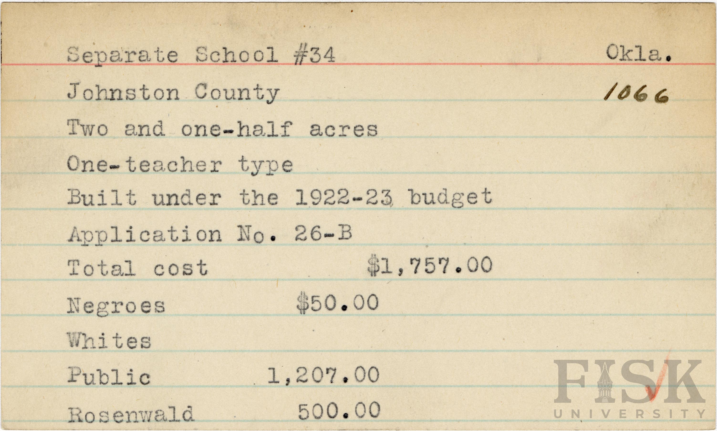 - School card from Rosenwald Fund for Separate School No. 34 in Johnston County, Oklahoma