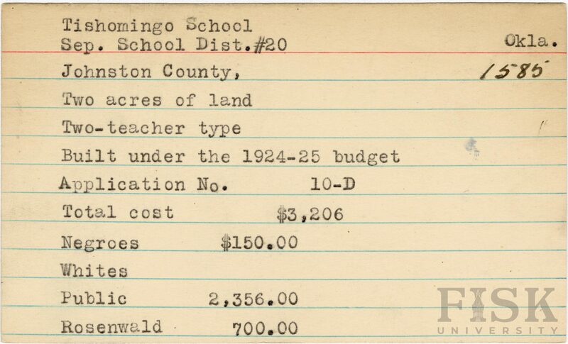 - School card from Rosenwald Fund for Tishomingo School in Johnston County, Oklahoma
