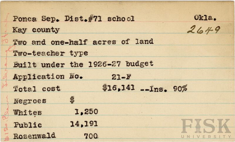 - Julius Rosenwald Fund--Buildings, African American schools--History--20th century, African American schools--Ponca Sep. Dist. No. 71 School