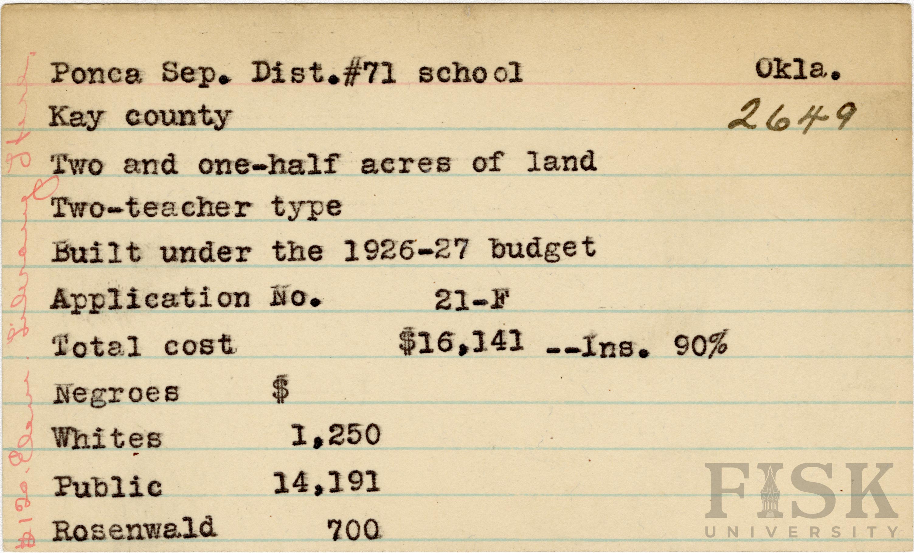 - School card from Rosenwald Fund for Ponca Sep. Dist. No. 71 School in Kay County, Oklahoma with a section added to the budget contributions that says, "Ins. 90%" and a handwritten note on the far left of the card that says, "$120 elem library here"