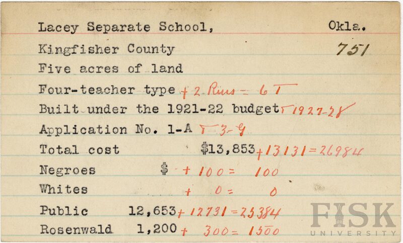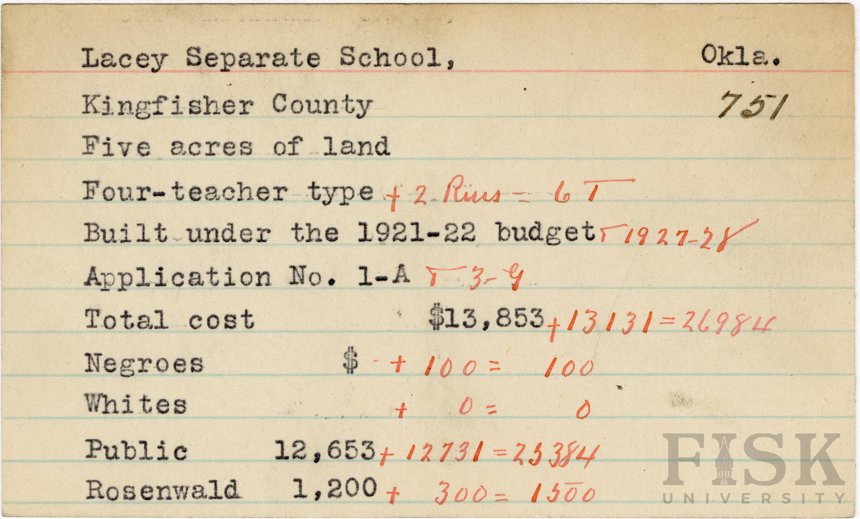 - School card from Rosenwald Fund for Lacey Separate School in Kingfisher County, Oklahoma with handwritten additions to the teacher type, budget year, application number, and budget contribution sections